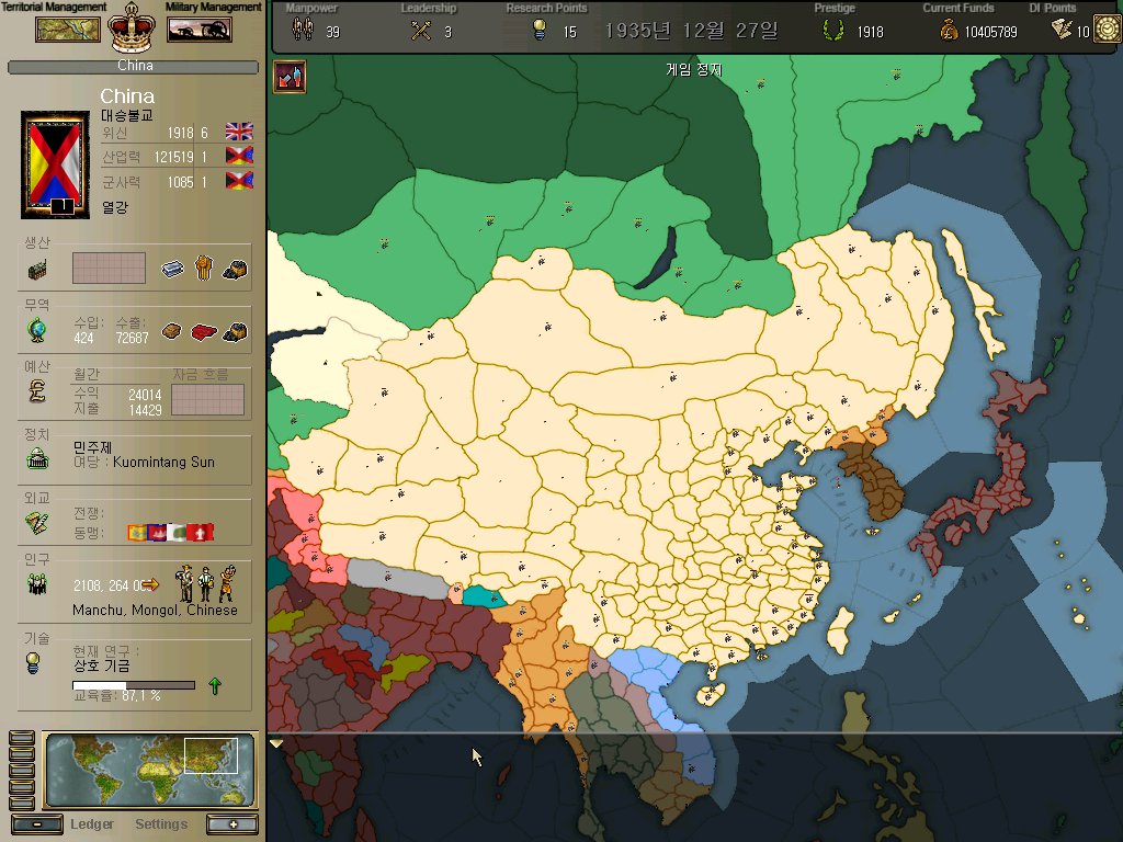 세이브파일 정리하다 찾은 겁니다. 1836년 그캠 시나리오로 시작해서 1936년까지 했던 건데, 치트나 모딩은 1900년대 넘어가면서 북방계 + 남방계로 chinese되게 한 거 하나 있네요.(어차피 슬슬 국민당이 뜨는 시점이라 별 상관은 없을 겁니다.)