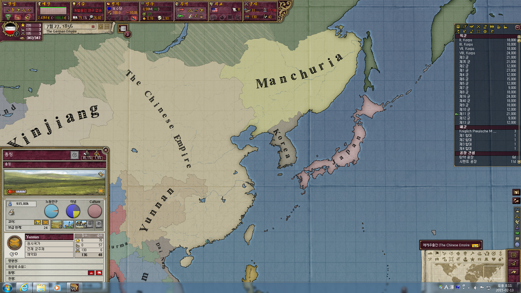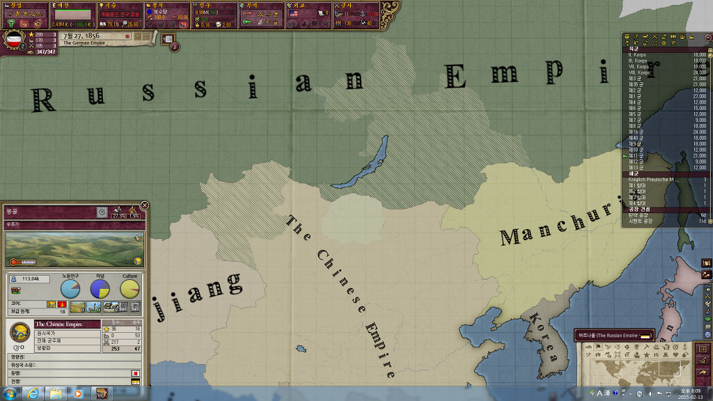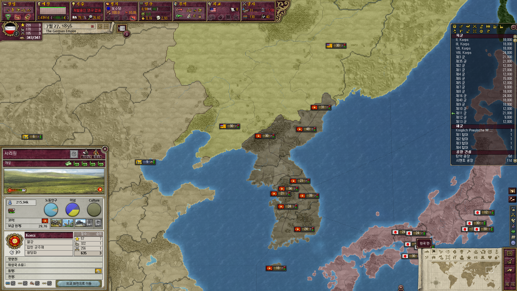 그리고 독일은 유럽 아프리카 진출하는중 모로코 다박살냇고 코칸드와 페르시아는 군비제한을걸고 알제리땅먹고 프랑스는 점령한상태로 망할때까지기다리는중 -