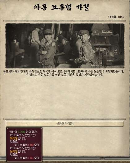분노한 인민들을 달래기 위해, 국왕과 정부는 아동 노동법을 제정하여 새 나라의 어린이들의 건강과 행복을 보장했다.