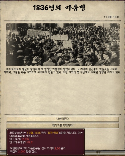 하지만 좋은 일만 일어나지는 않는 법. 코트부스 지역에 프로이센인들의 주식인 감자에 치명적인 감자 역병이 돌았다. 다른 선택을 하기에는 자유주의니 뭐니 하는 해로운 의견이 너무나도 성장하기에 왕은 눈물을 머금고 내버려두었다.