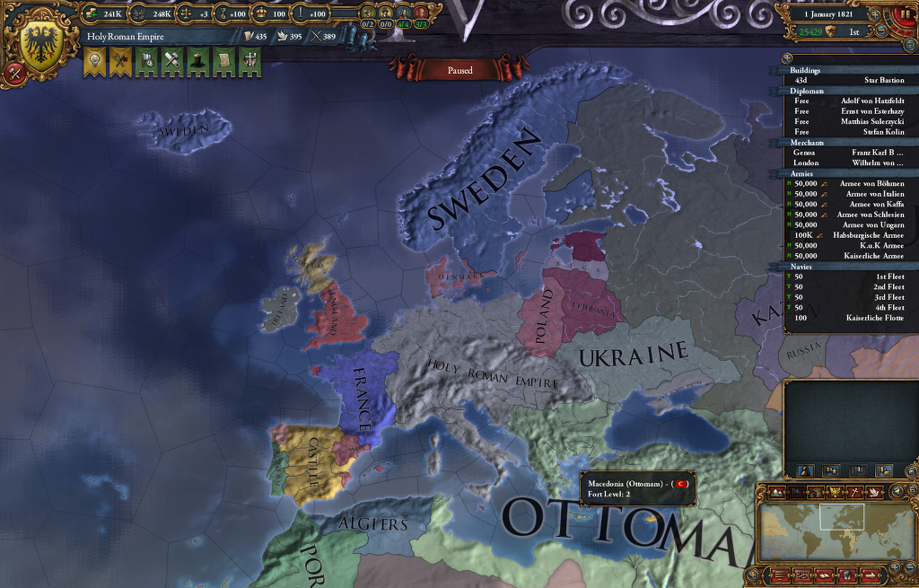 저 국가들중 아일랜드, 폴란드, 리투아니아, 우크라이나, 리가, 리보니안, 고틀란드가 속국인 상태입니다.