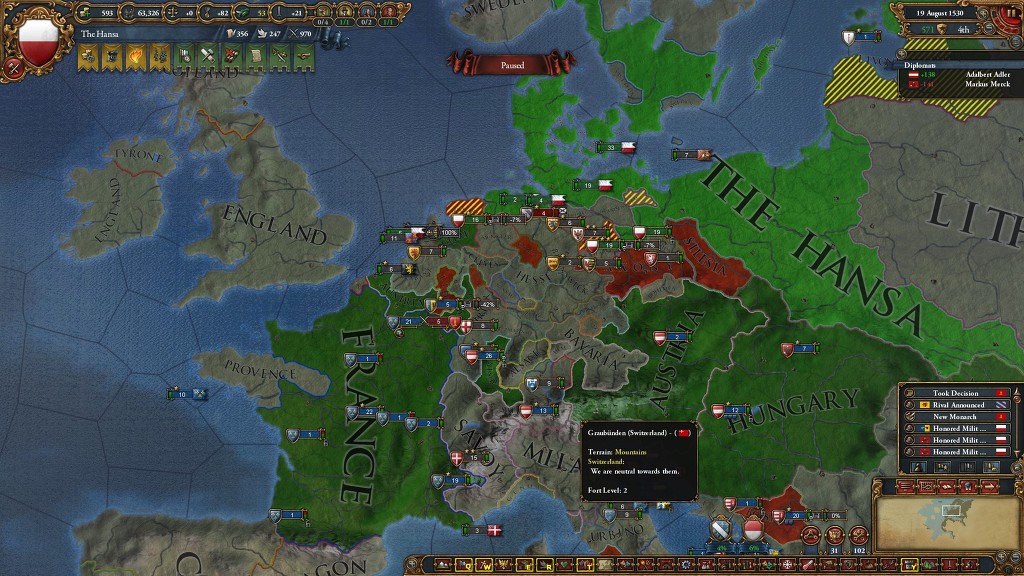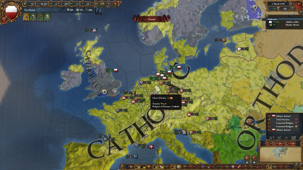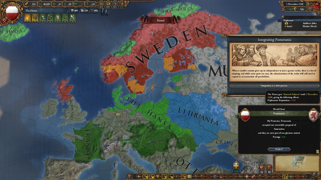 아 포메라니아 합병을 완료했습니다. 문화세탁 조건을 헷갈려서 오래썼는데 한 개발도 160정도를 외교포인트로 바꿔먹으니 적당하네요. 합병하고보니 승천중인 AI 폴란드 느낌이 더욱 강해졌습니다 ㅋㅋ