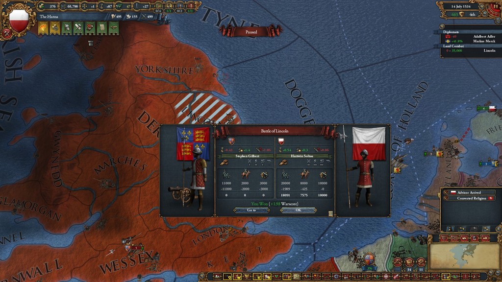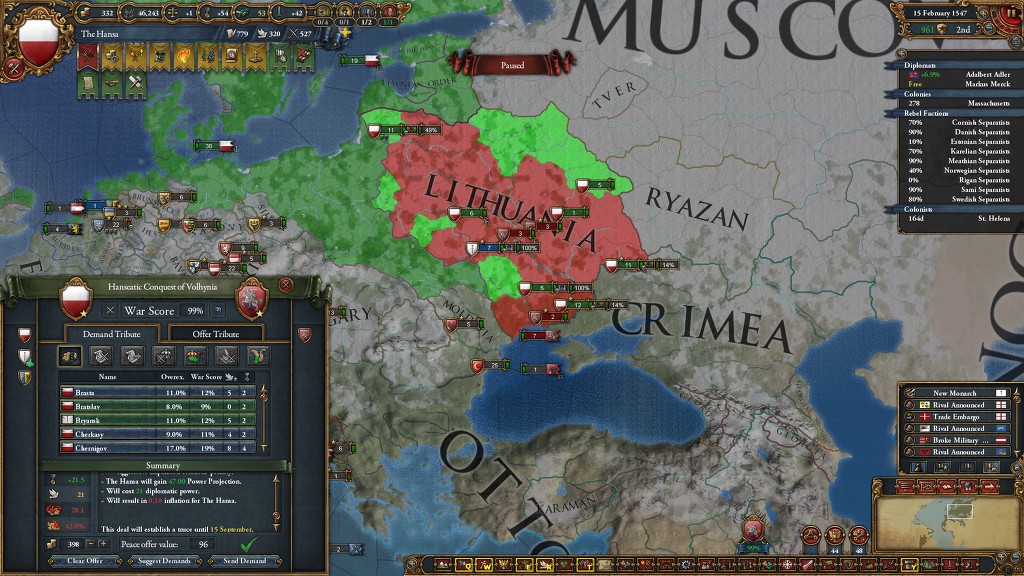 다시 리투아니아 전쟁으로 돌아와서 이렇게 동맹없이 혼자 때리니 맨파워+돈은 좀 더 들어가도 PP를 독식합니다.