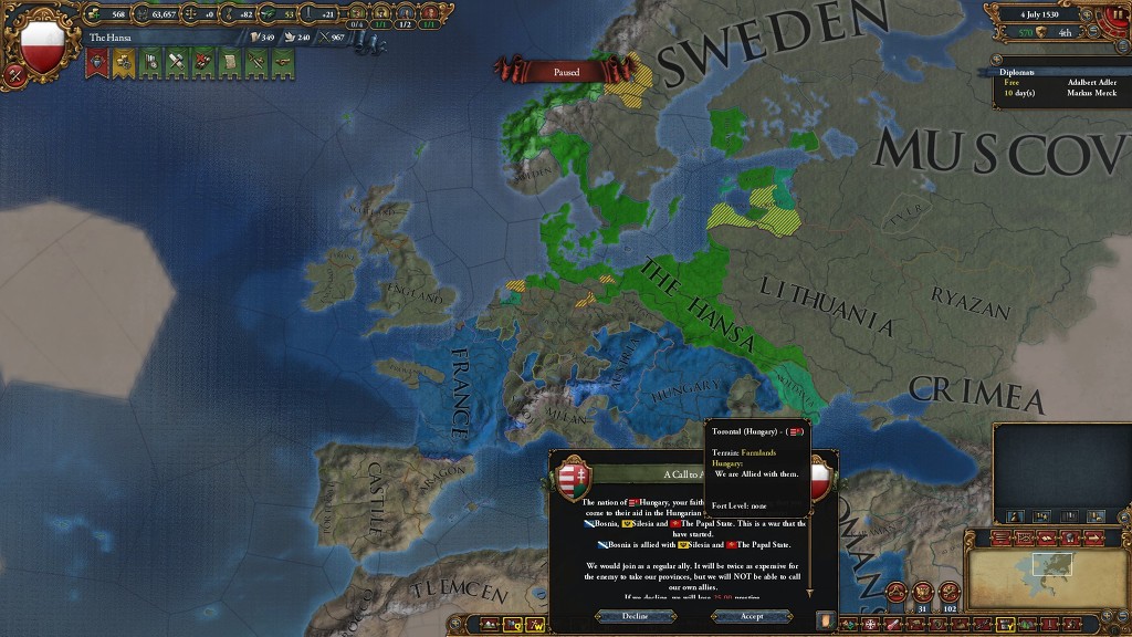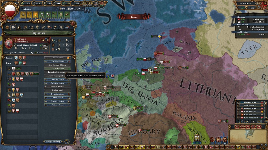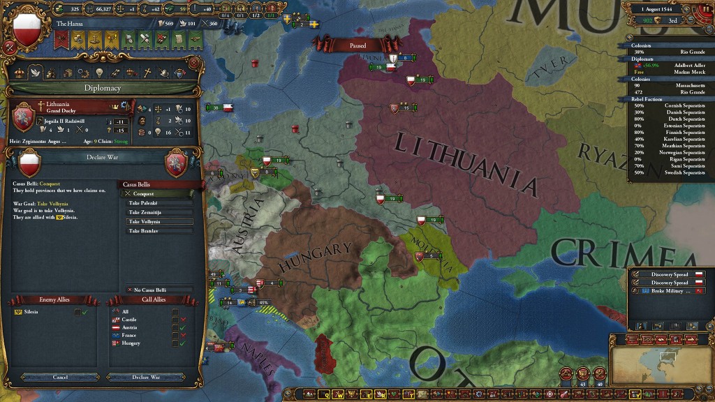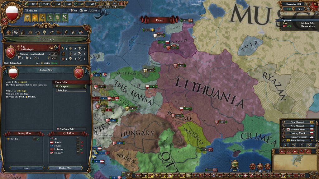 튜튼을 목표로 선전포고하는데 동맹인 리투아니아가 메멜 항구 클레임이 있는 상황. 이럴때는 선전포고때 체크해제하고 그 지역에 부대를 올리고 수동콜투암을 해줍니다. 리투아니아도 어차피 쓰다 버릴 패죠 뭐ㅋㅋ