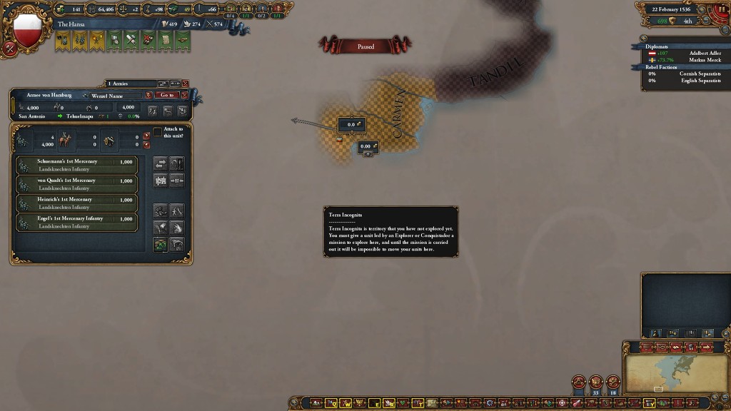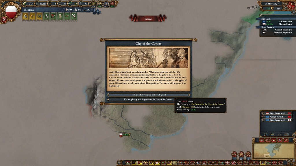탐험아이디어로 후일 들어올 신대륙/동방의 무역을 받기위한 서쪽 확장을 시작합니다.