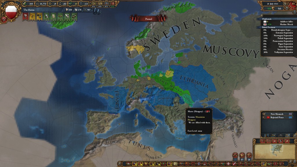 발트해 정리의 마지막. 리보니안 오더는 속국화 시켰습니다. 아이디어가 러시아지역 코어+개종노예에 딱 맞게 생겼더라고요ㅎㅎ