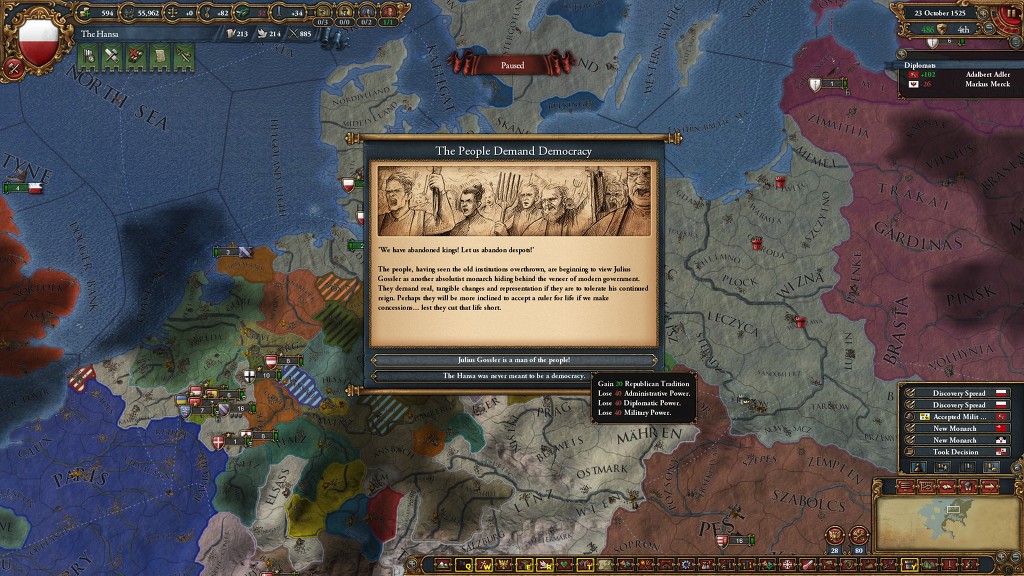 그리고 무엇보다도 프로젝트의 위기였죠. 이때 아이디어는 영향-행정. 금권을 못찍고 군주정이 된다면 프로젝트는 실패..