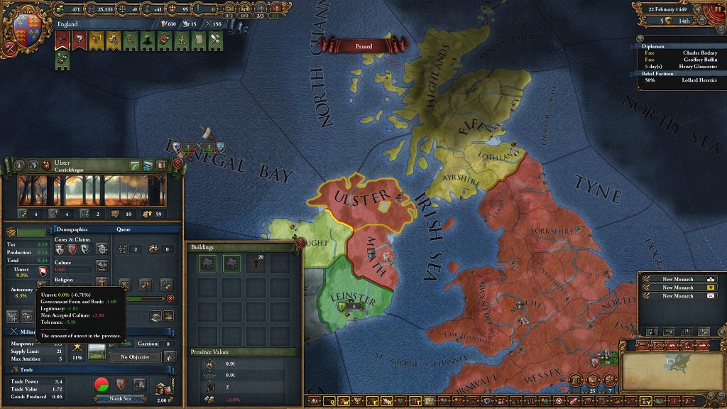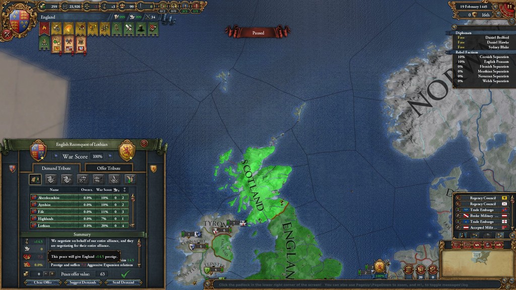 위신이 손해냐.. 아닙니다. 위에 스샷은 예시를 위해 찍은거고 보통 한 워스코어 100% 정도 땅을 집었다가 놔주고 재정복하면서 땅 한뭉텅이씩 자치도를 내려준다는 가정하에 100% 비슷한 스코틀랜드를 보면
