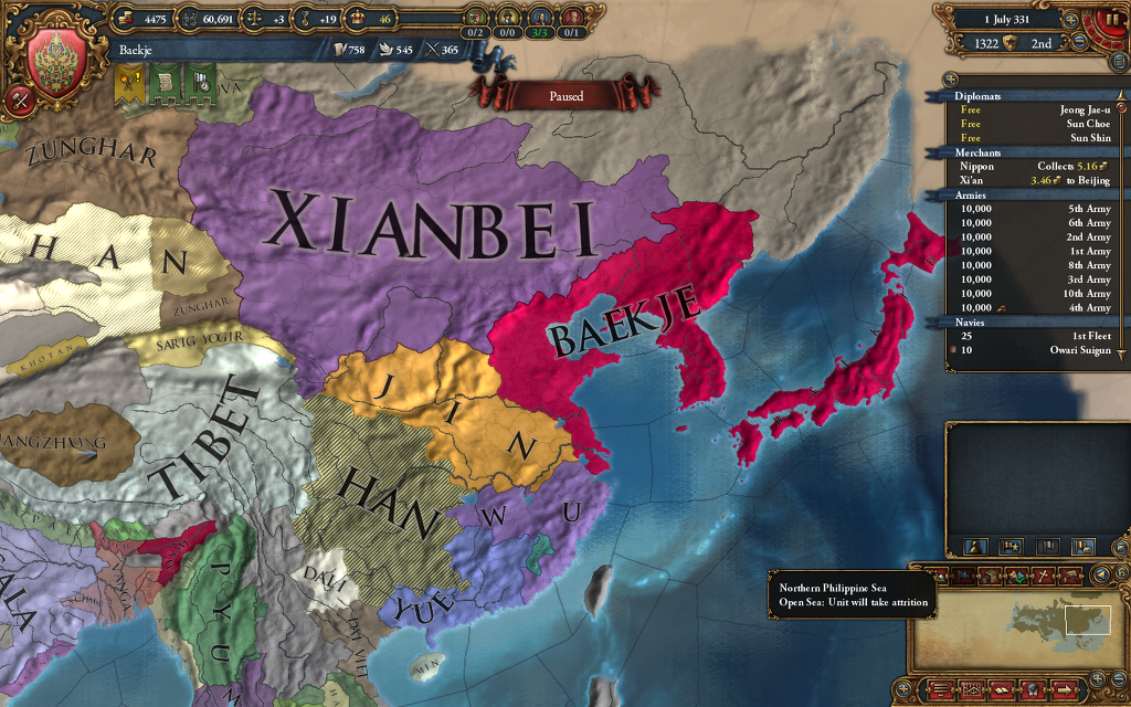 없는 국력에 일본 접수하고 영혼에 한타로 한나라를 쪼개버리고 만든 간지 판도 입니다.