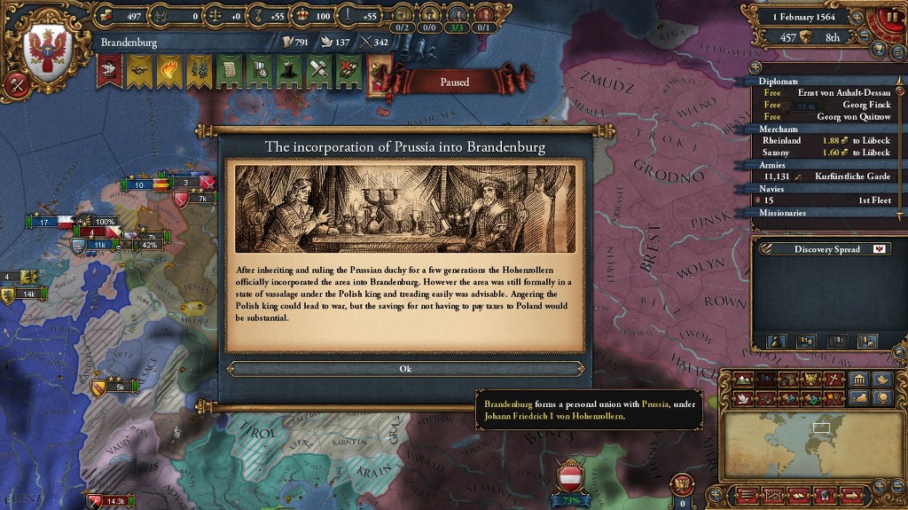 왠지 브란덴으로 시작해서 프로이센 이벤트로 퍼유하고 규율 깡패 쌍두마차를 달려보고 싶어서 그렇게 했봤습니다...만