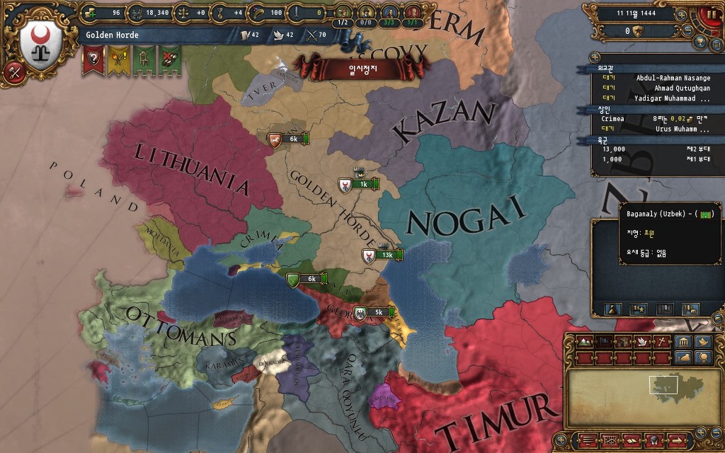 유로파도 역시 다른 역사 시뮬겜 처럼 초반에 약할때가 재밌죠. 여지껏 해본 나라중에 스웨덴이 시작 개발도가 제일 낮았거든요. 골든호드는 더 약할줄 알았는데 의외로 스웨덴보다 개발도가 높네요. 자 이제 어느 나라랑 동맹을 맺고 어느 나라를 조져야할지 생각 중입니다.