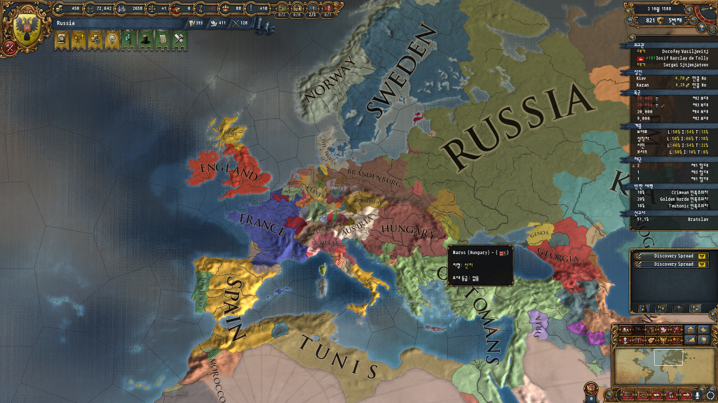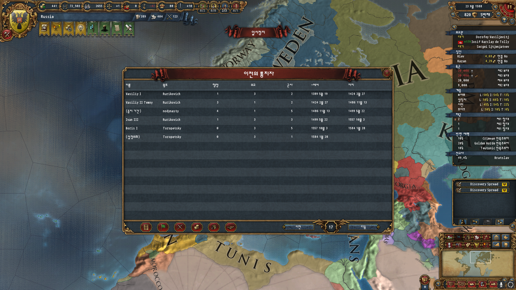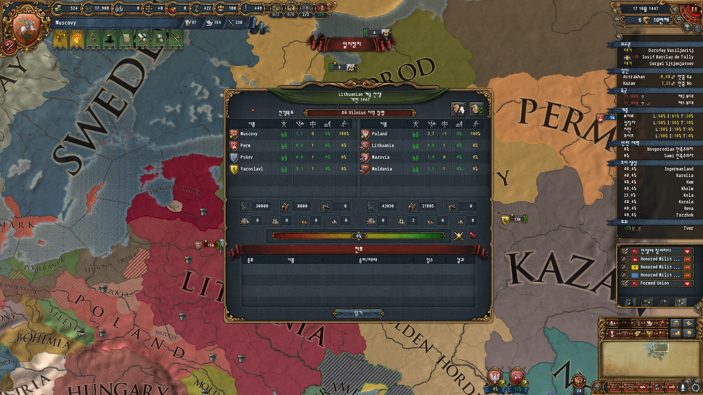 분명 리투아니아를 동군으로 먹었는데... 브랑덴부르크 저거 신롬황젭니다.... 그런거 다 무시하고 칠려니까 종교전쟁대기중이라 침략도 못합니다... 그나마 다행인건 저 옆에 카자흐가 제 속국이라 오이랏까지 쭉뻗어 있긴합니다