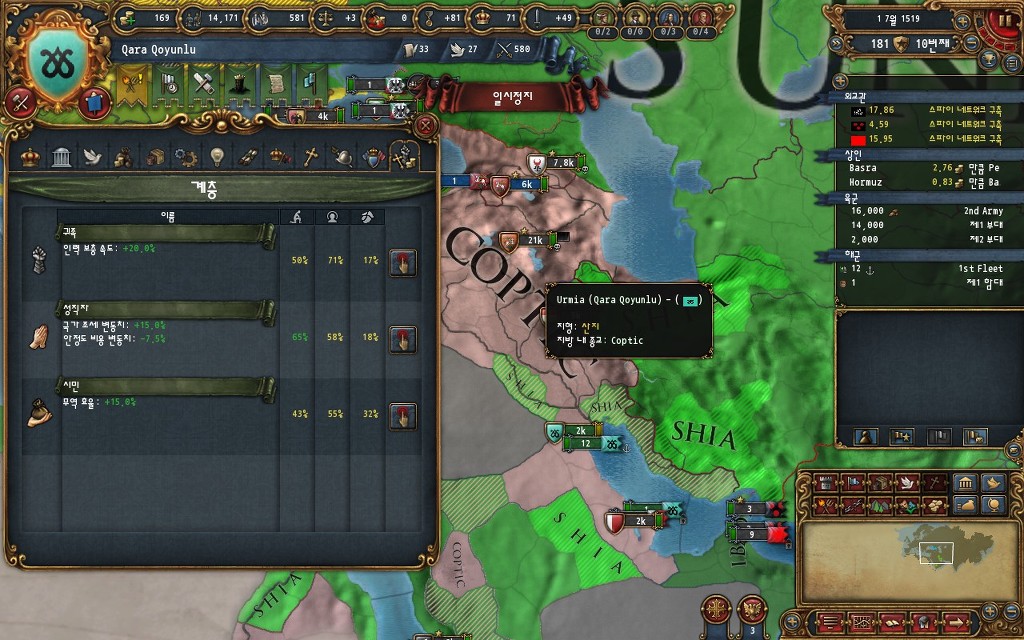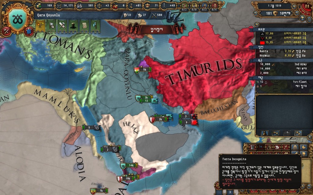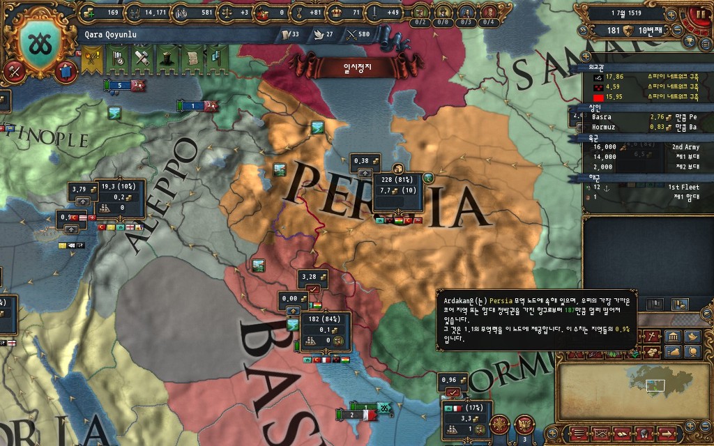 시작위치가 좋아서 페르시아 노드의 무역중심지를 쉽게 먹을 수 있다는게 장점이네요. 시작하고 아크코윤루, 조지아, 타바레스탄을 쉽게 속국화 할수 있구요. 아크코윤루가 오스만 다음으로 르네상스를 수용해서 아크코윤루를 합병하니 르네상스가 수용이되네요. 1500년 경에 겨우 됬지만 그나마도 저보다 동쪽에 있는 나라들은 르네상스 된 국가가 없으니 나쁘진 않은것 같습니다.