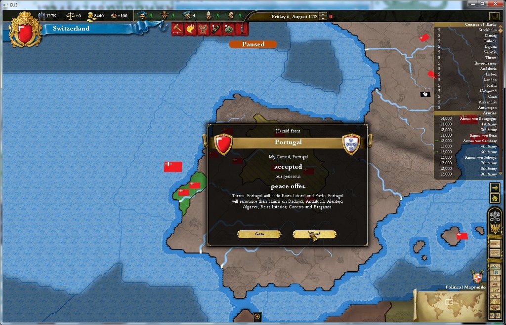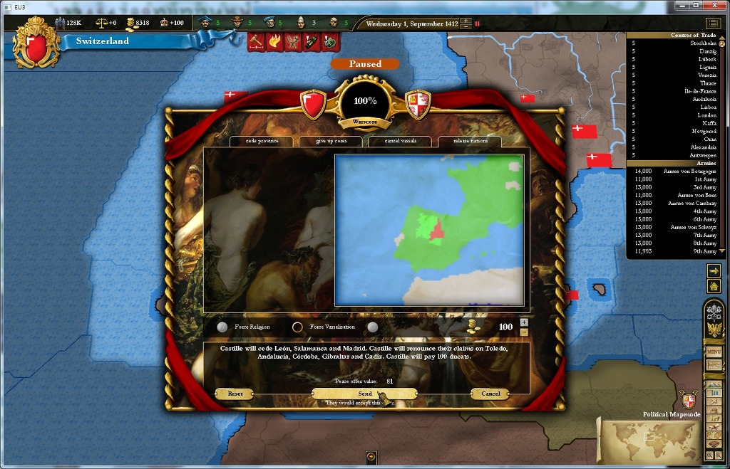그에 따라 저 먼 동부에서 단걸음에 카스티야로 달려온 유슬림 공은 단 3일만에 카스티야가 가진 모든것을 빼앗는 악랄한(?) 평화협정을 마치고는 바람처럼 자신의 담당지로 복귀해버렸다고.