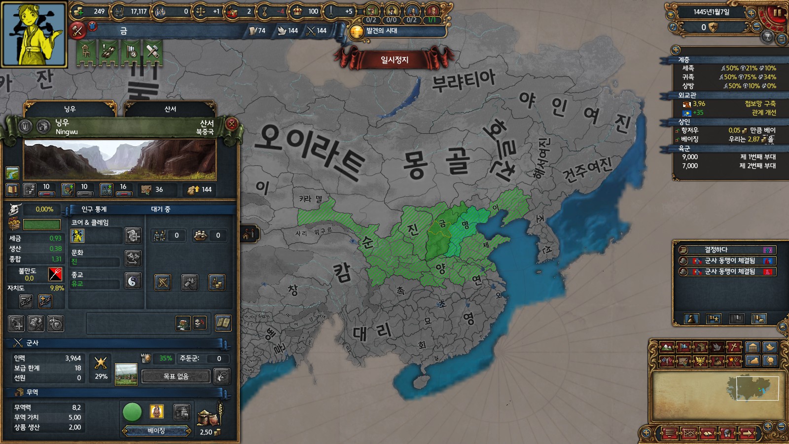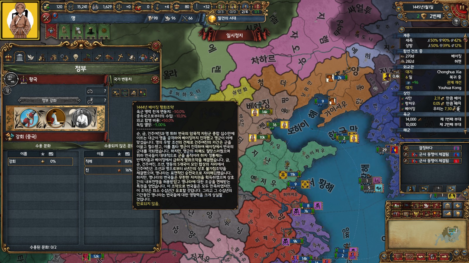 명나라는 이제 AI와 플레이어를 가리지 않고 베이징 평화조약이라는 심각한 패널티를 발견의 시대가 끝날때 까지 가지게됩니다. 독립열망 -5% + 명나라의 확정적 선영향 때문에 독립열망은 좀더 떨어지긴 하겠네요.