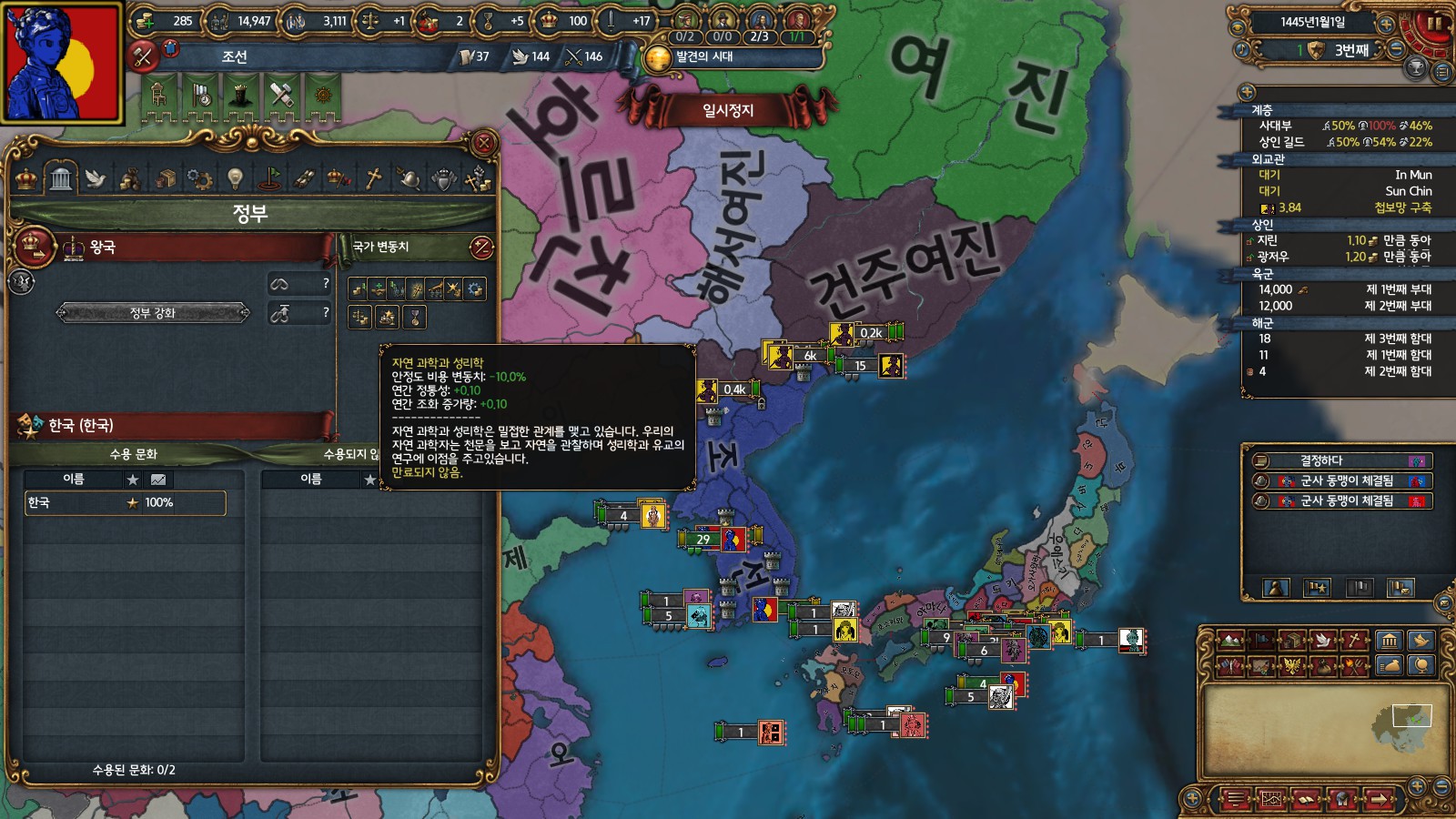 유교는 사대부에게서 2, 혹은 3렙의 자연 과학자 조언가를 얻을수 있습니다. 유교를 신봉하고, 조언가에 자연 과학자가 있을경우 약소한 이익을 얻을수 있습니다.