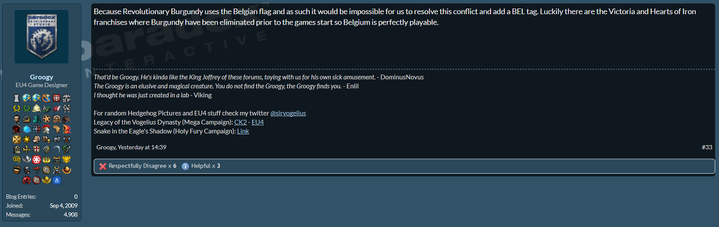 한 벨기에 사람이 "스칸디나비아 같은 가상 국가 형성은 되는데 왜 내 선조들이 지키기 위해 피흘린 내 국가를 플레이할 수 없는지 모르겠다." 란 글을 올리고 이유를 알려달라고 하자 개발자가 혁명 부르고뉴 깃발이 벨기에 깃발을 사용하기 때문이라는 답변과 함께 빅토나 호이에선 벨기에 플레이 가능이라는 답변을 함.