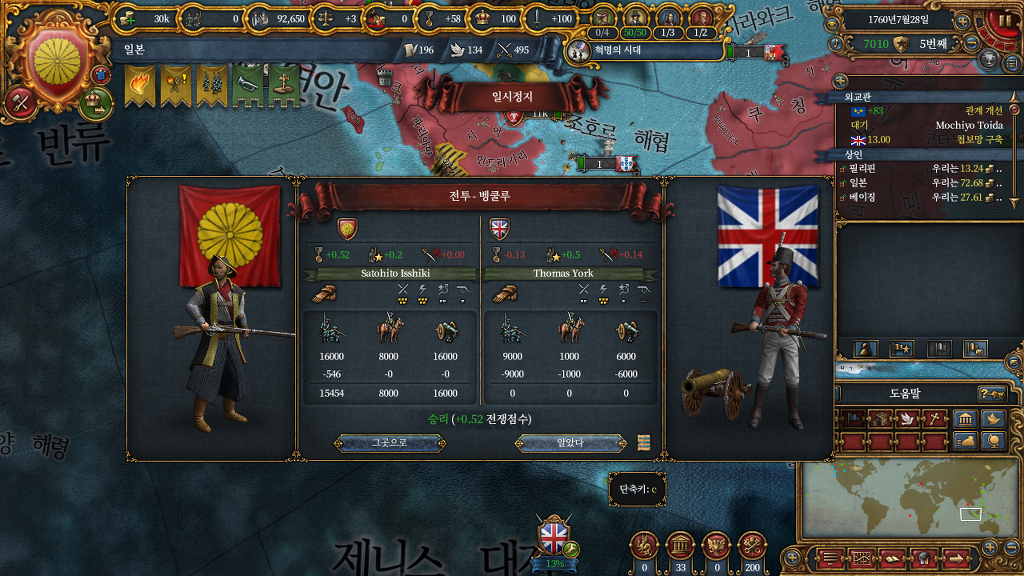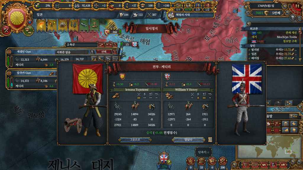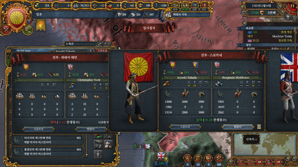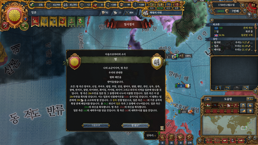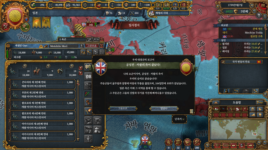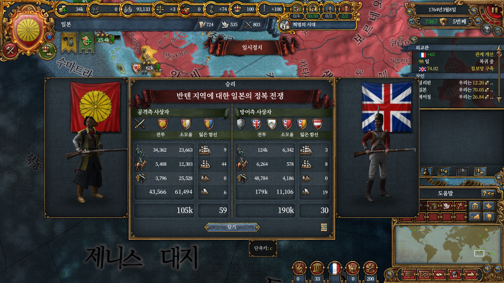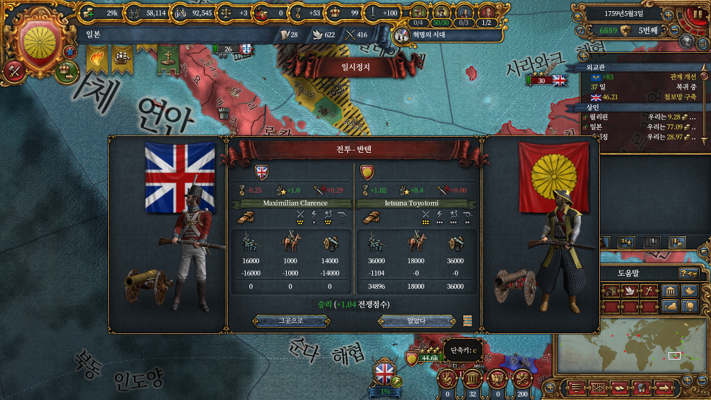 결국 일본은 브리튼을 상대로 승리를 거두어 자바 섬 절반과 주변의 자잘한 지역을 먹는데 성공하였다. 이제 일본의 앞길을 가로막을만한 세력은 포르투갈, 그리고 극강의 전력을 가진 스페인 뿐이었다.