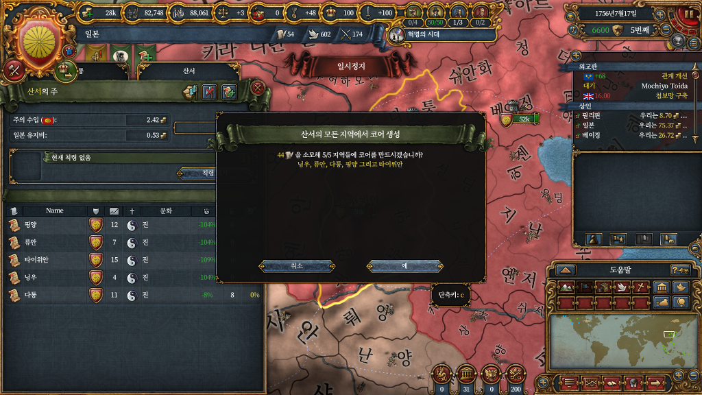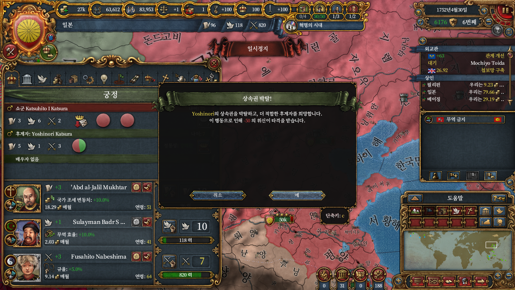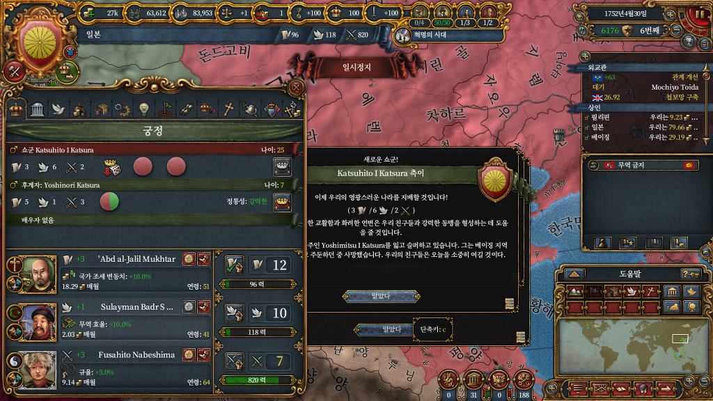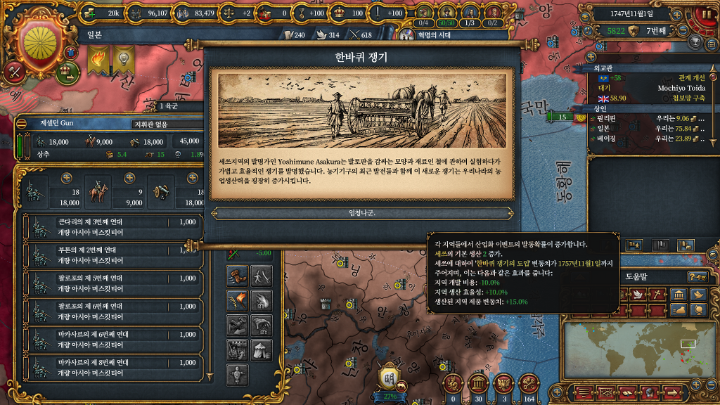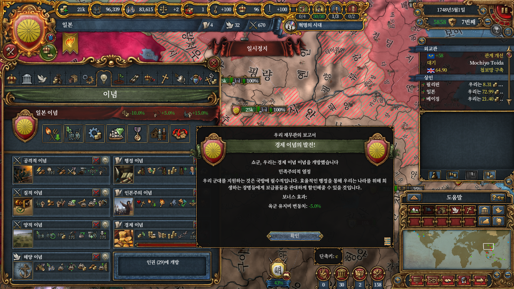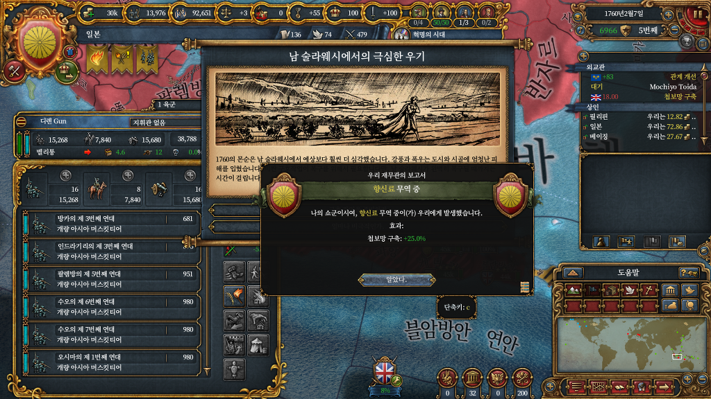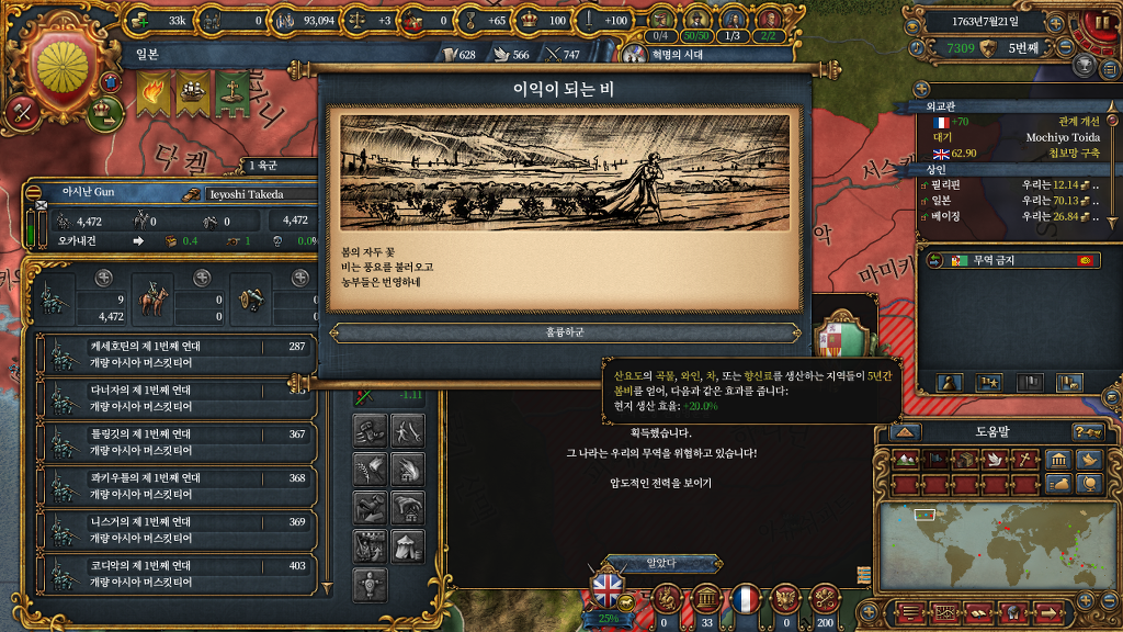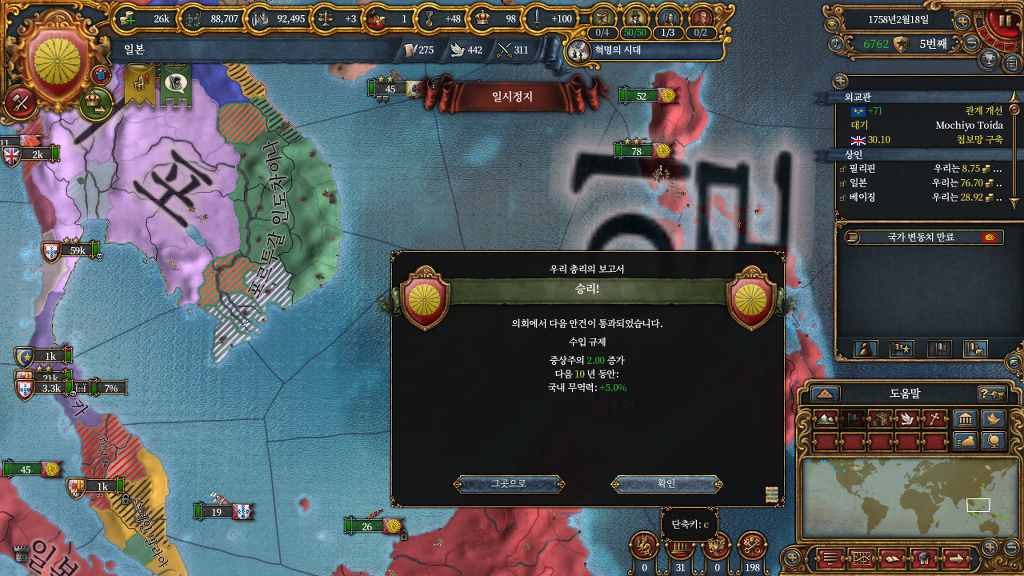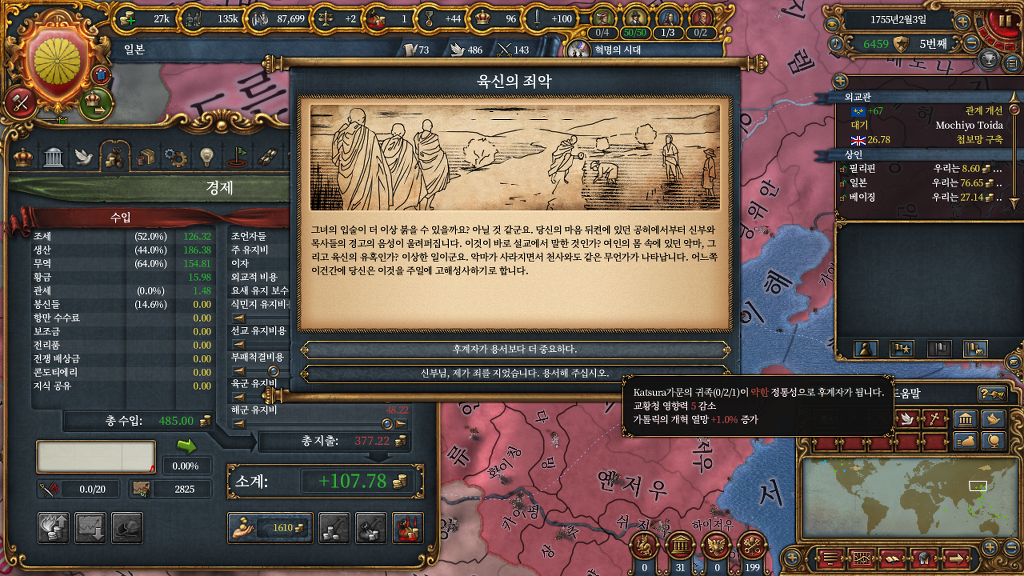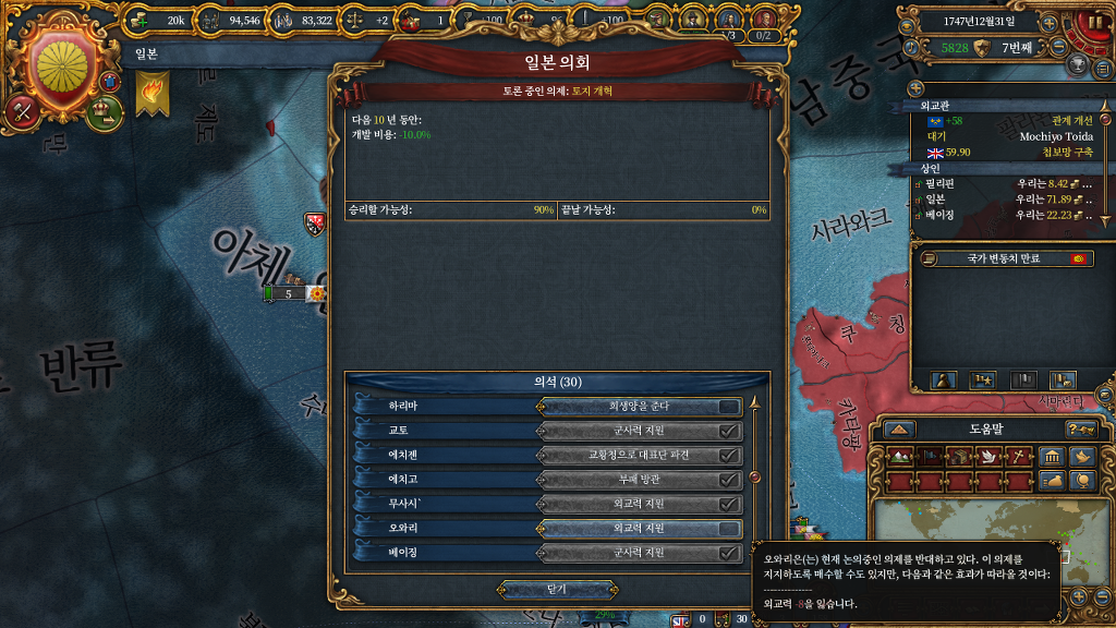 한편 어라하의 간곡한 '설득'으로 의원들은 중상주의 정책을 채택하고 일본 국내 무역력을 증가시키는 법안을 통과시켰다. 의원들은 진짜 사람을 부글거리게 만드는 무언가가 있는 놈들이었다.