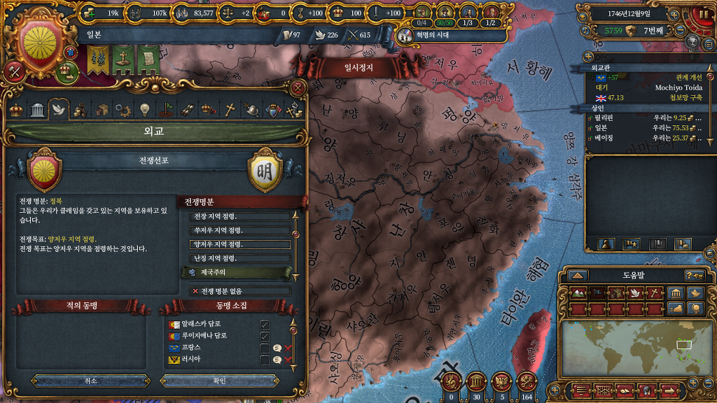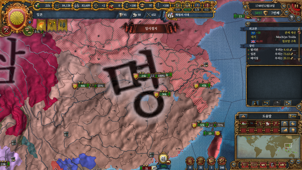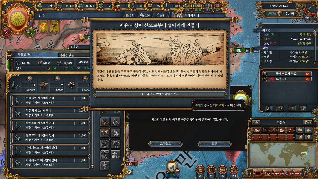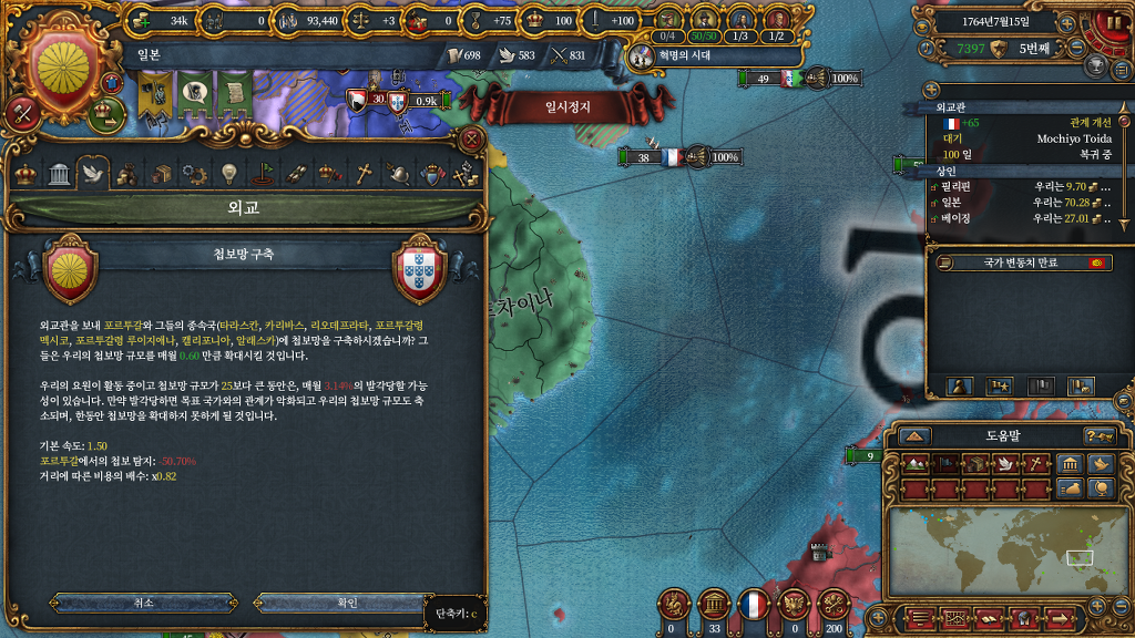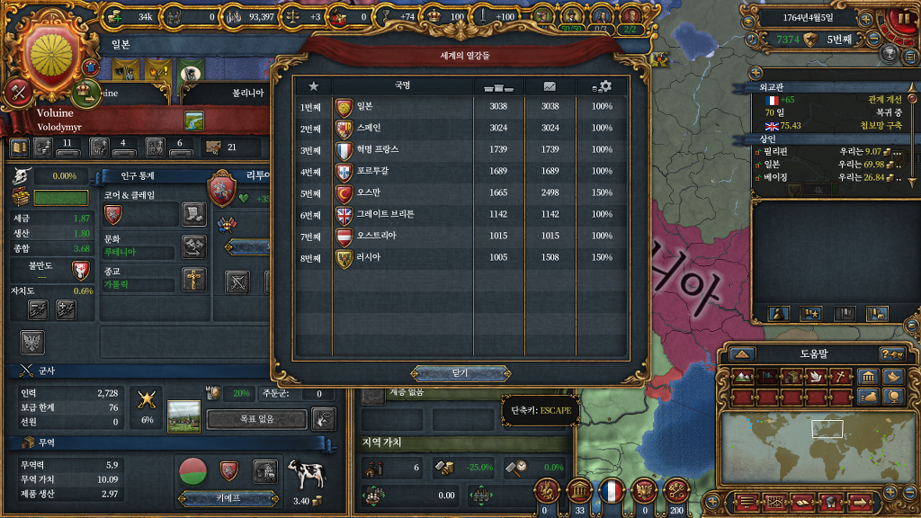 1764년 당시 열강 세력도. 일본과 스페인이 세계 1, 2위의 국력을 다투었고 혁명을 일으킨 프랑스와 식민지대국 포르투갈이 뒤를 이었다. 오스만과 러시아의 저력은 상당했으나 계몽주의 사상을 받지 못해서 허덕이고 있었고 브리튼과 오스트리아는 간신히 열강의 지위를 유지할 뿐이었다. 이제 세계는 일본이나 스페인, 둘 중 하나가 패권을 잡을 것이다.