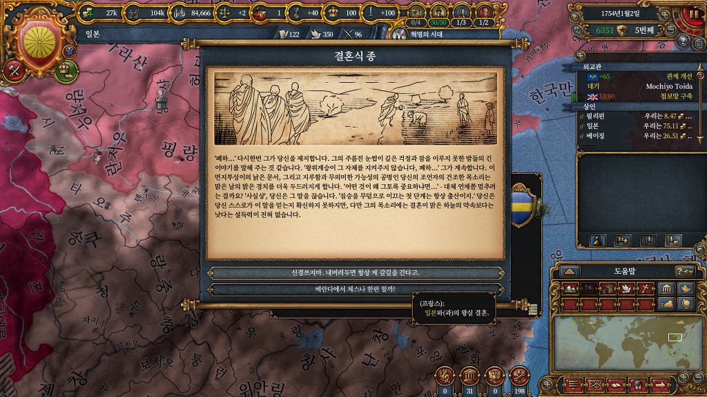 어라하는 분위기를 쇄신하기 위해 프랑스와 일본의 왕실 결혼을 지원하였다.