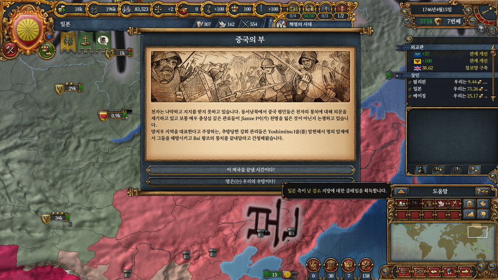 일본의 번영은 군사에서만 국한된 것이 아니었다. 도자기와 차 무역에 이어서 향신료 무역 또한 일본이 무역을 주도하였다. 이제 조금만 더 노력하면 비단과 종이 무역도 일본의 손에 들어올 것이었다.
