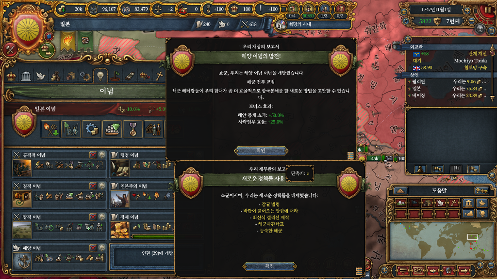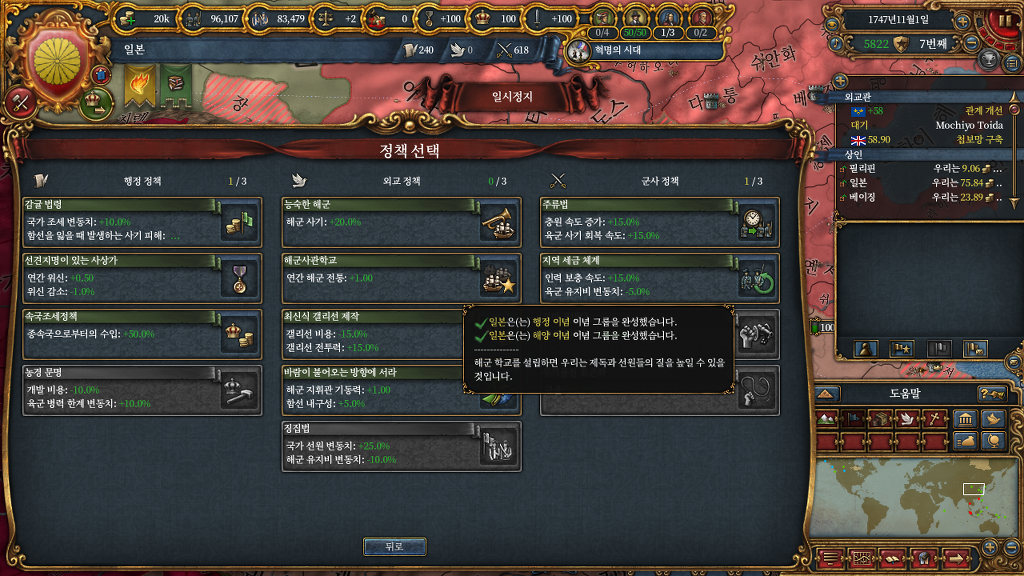 어라하는 해군사관학교를 설립하게 했다. 이는 일본의 약점들 중 하나인 해군 전통을 보강해주는 멋진 정책이었다. 그리고 외교 기술이 발전되면 해군 지휘관 기동력과 함선 내구성을 올려주는 정책을 더 선택 예정이었다.