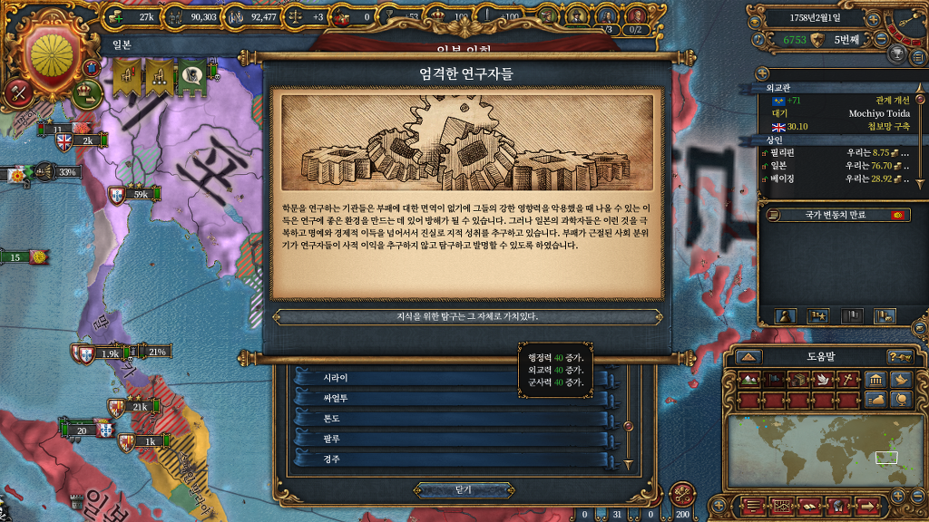 1758년은 일본에게 있어서 새로운 학문적 성취를 이룩한 해였다. 행정적 진보, 생산 능력의 발달, 군사 기술의 혁신. 모든 것이 발달되었다.