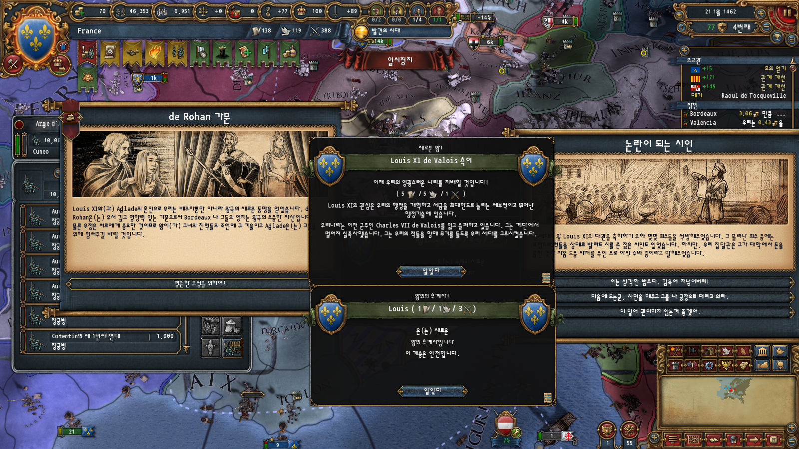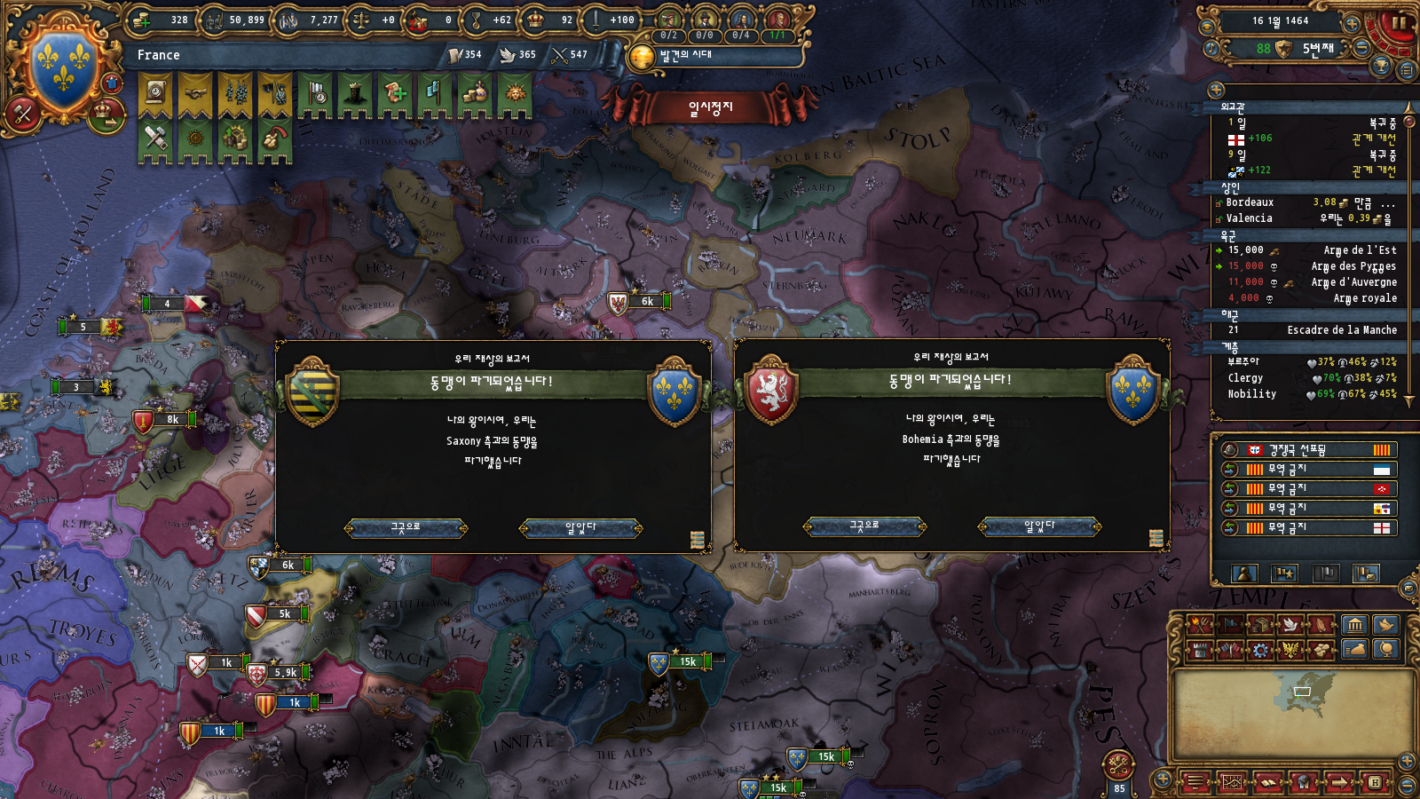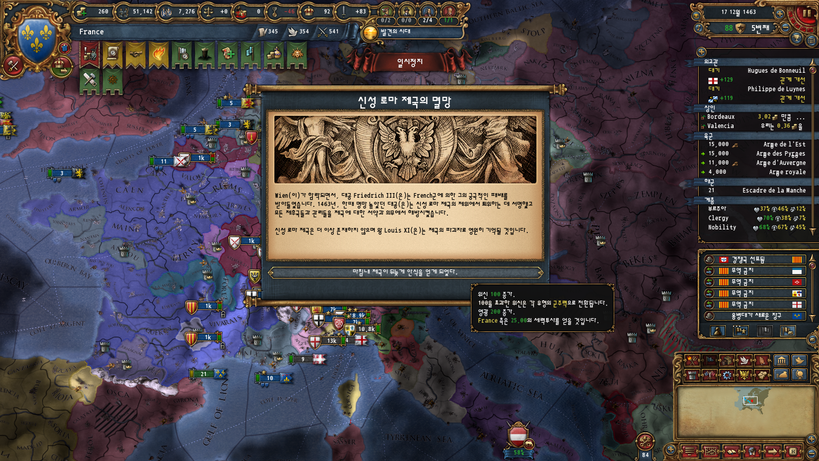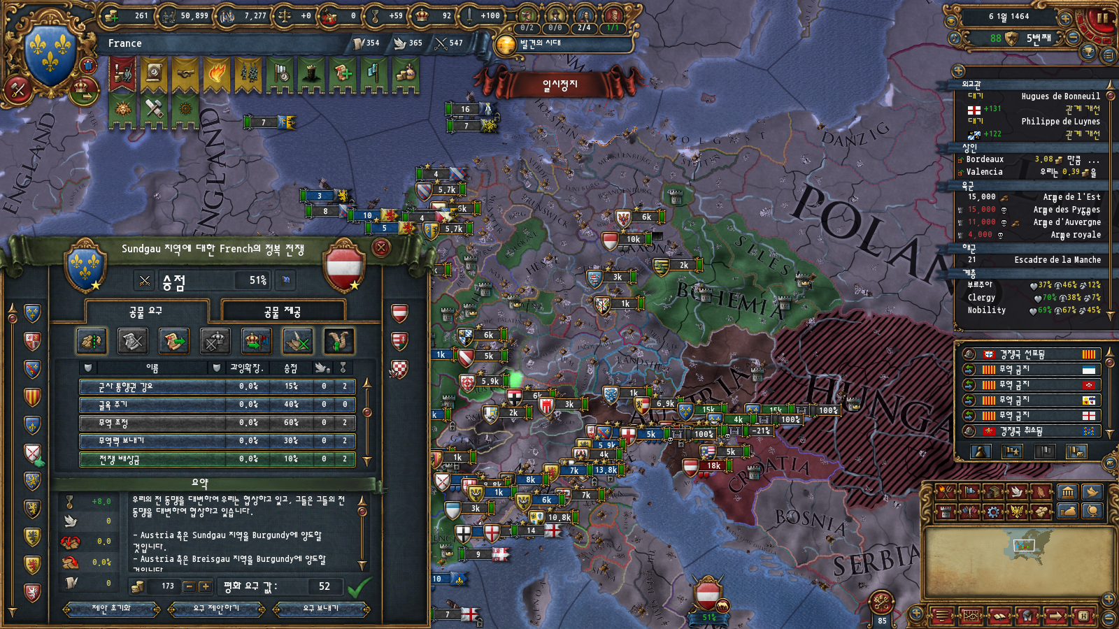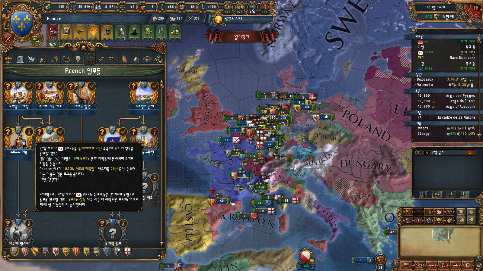 물론 이후 이벤트 체인에서 부르고뉴에게 동군연합 재결성 명분으로 선전포고가 가능하게 해 줍니다만 역시나 전쟁과 AE를 감당해야 하므로 시간적으로나 경제적으로나 군사적으로나 외교적으로나 모두 손해입니다
