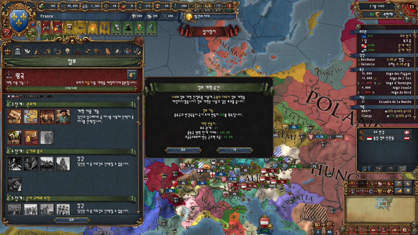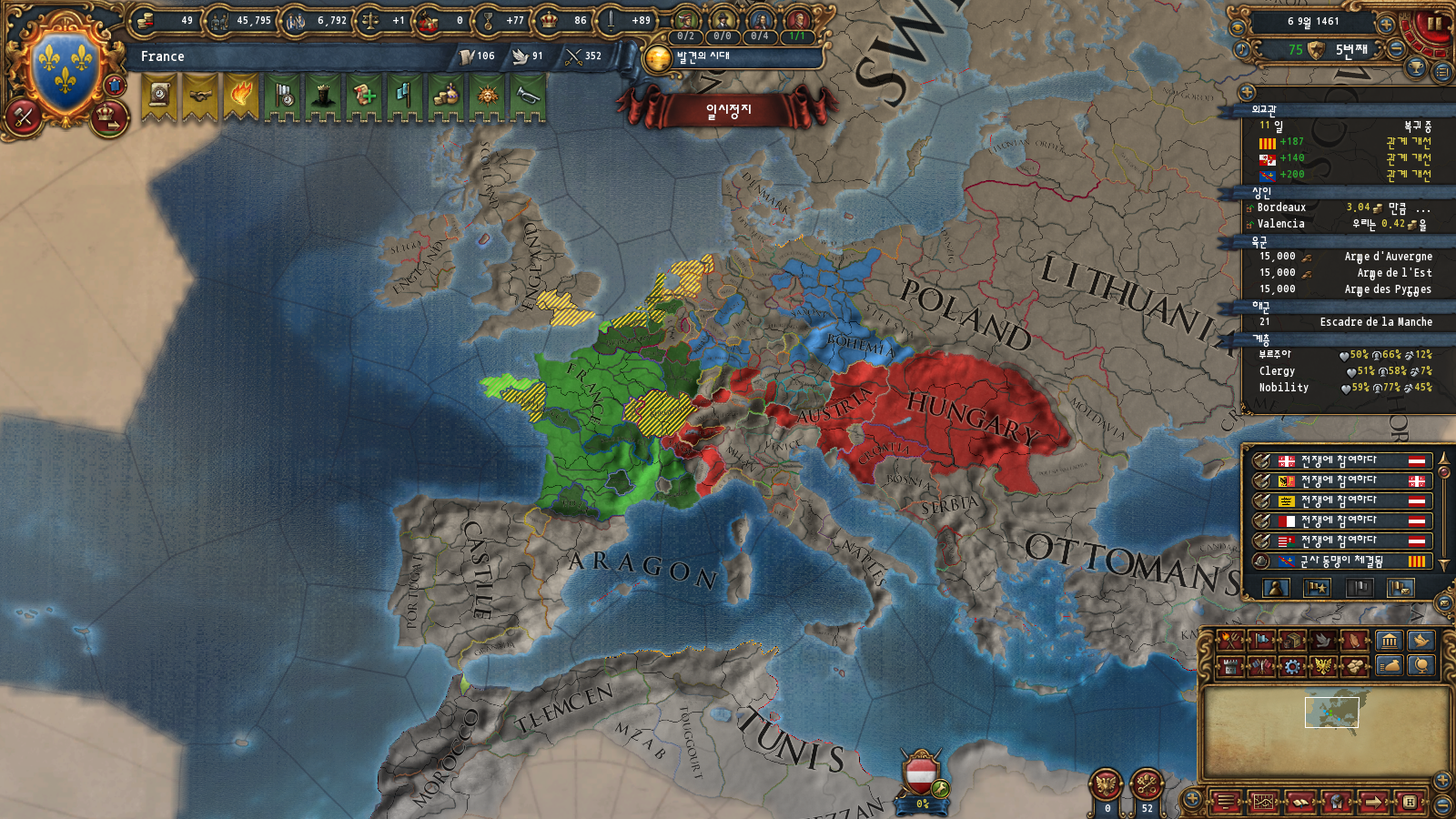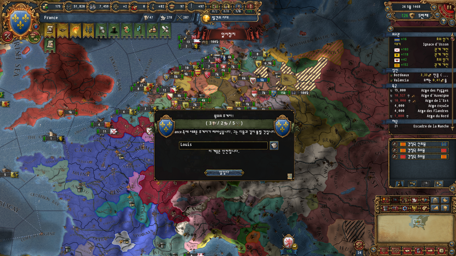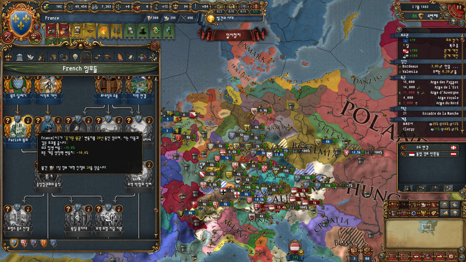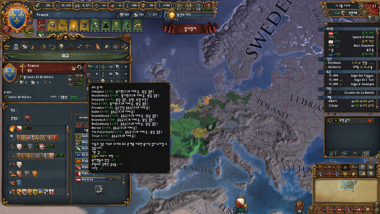 물론 이후 이벤트 체인에서 부르고뉴에게 동군연합 재결성 명분으로 선전포고가 가능하게 해 줍니다만 역시나 전쟁과 AE를 감당해야 하므로 시간적으로나 경제적으로나 군사적으로나 외교적으로나 모두 손해입니다