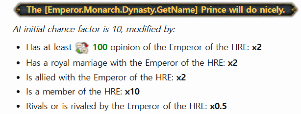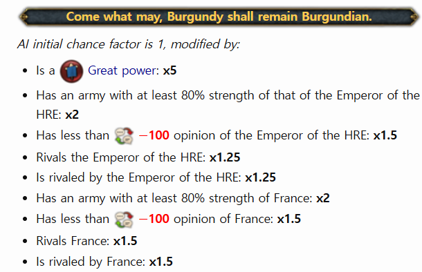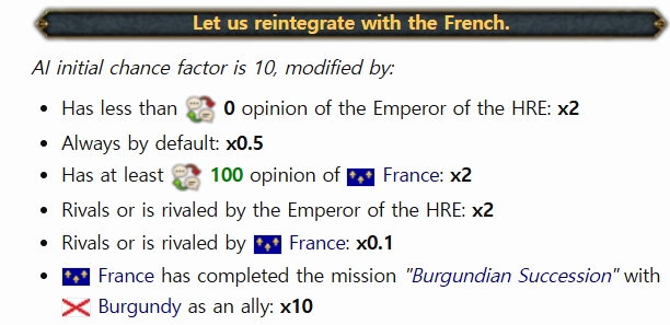 부르고뉴 상속 이벤트에서 AI의 선택지는 일반적으로 프랑스 및 신롬 황제의 관계에 영향을 받습니다