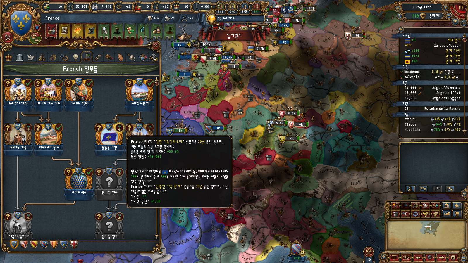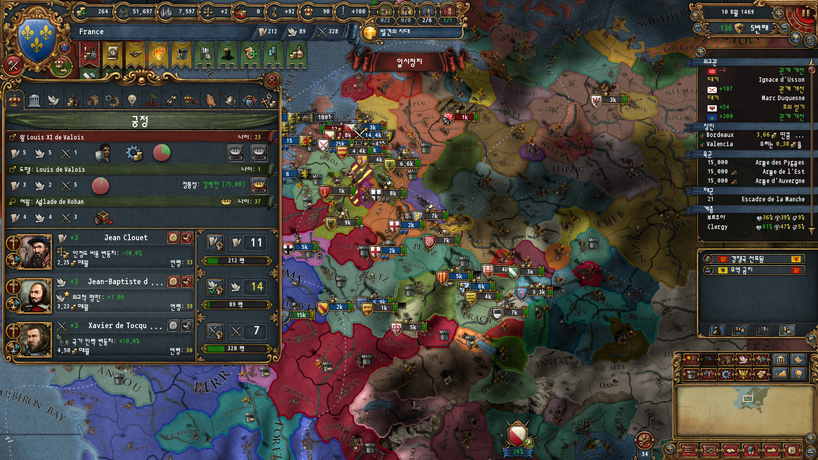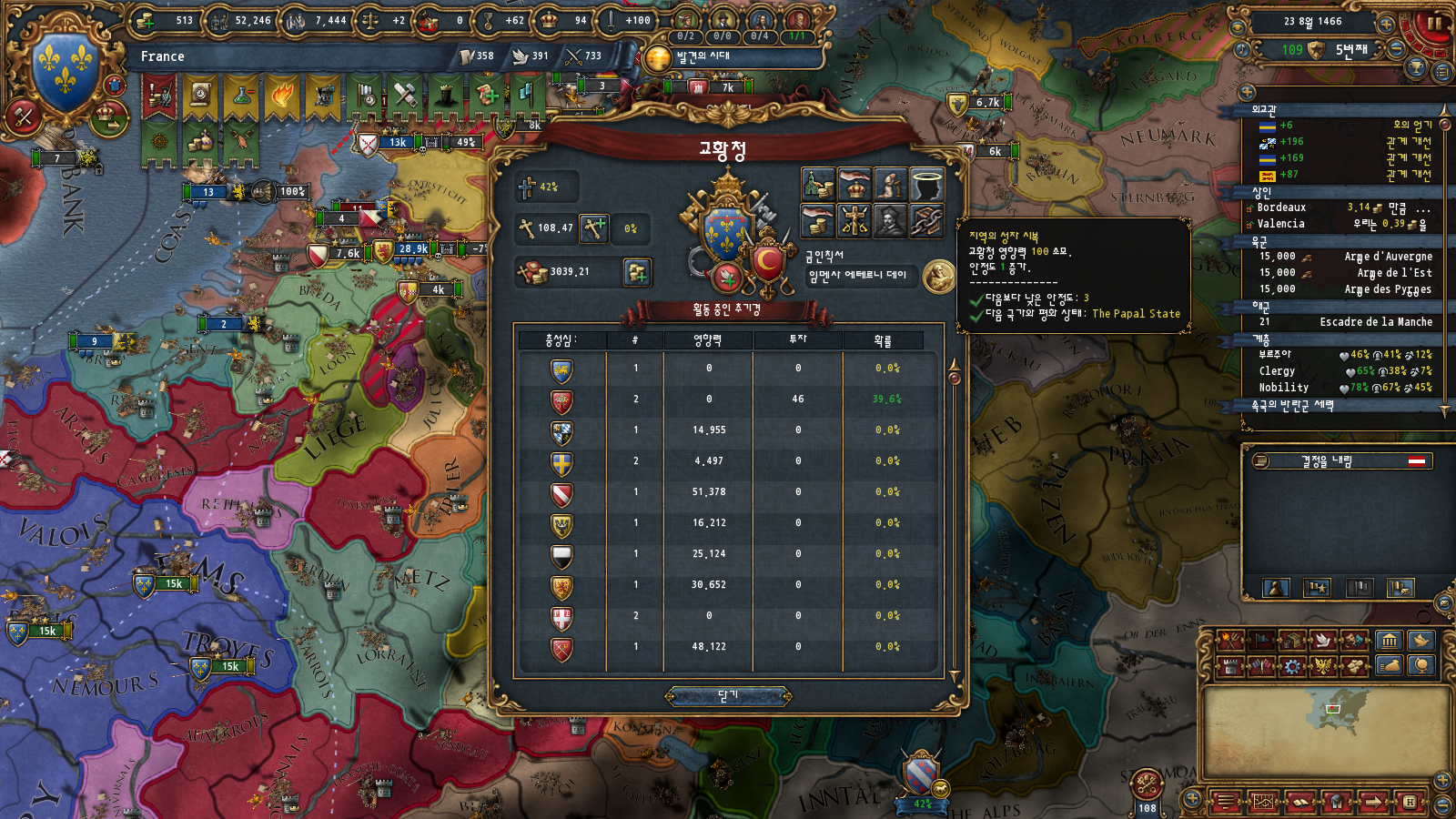 왕과 후계는 정말 좋은 능력치까지는 아닙니다만 프랑스 경제력 자체가 조언가 레벨을 초반부터 높게 굴릴 수 있어 포인트가 잘 벌린다는 게 보이실 겁니다