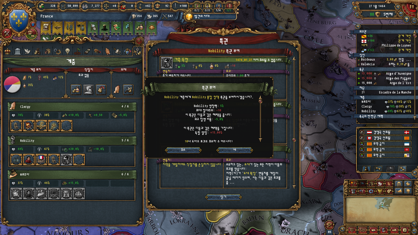 이제 왕자령을 추가로 합병할 시점인데, 여기서 발생하는 외교 평판 페널티는 외교적 속국화에 있어 치명적이므로 귀족 특권을 통해 예방해 주겠습니다