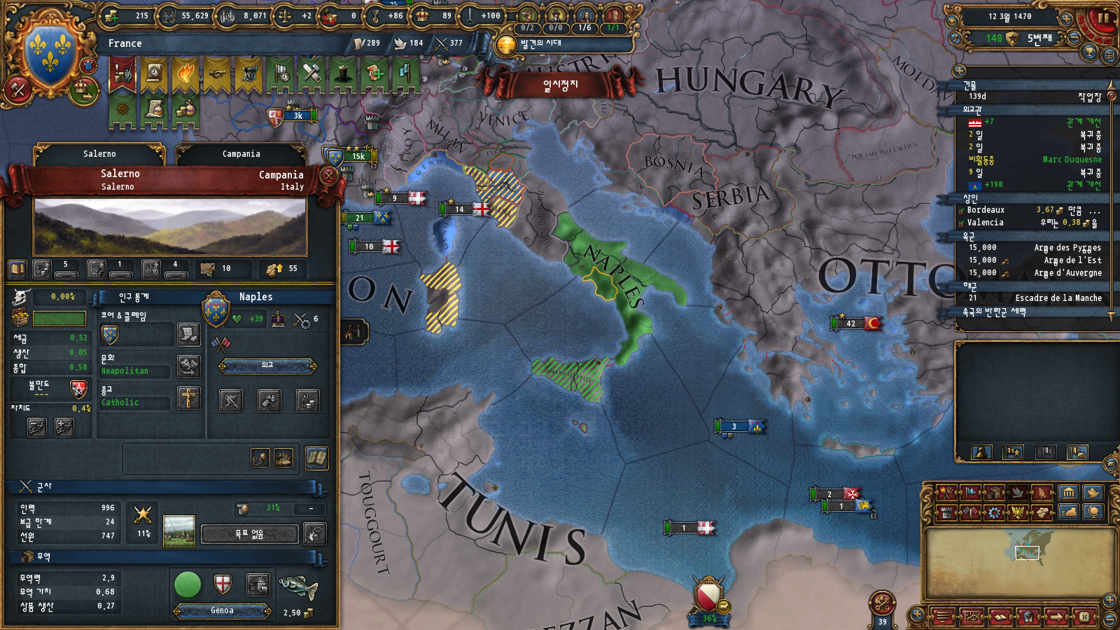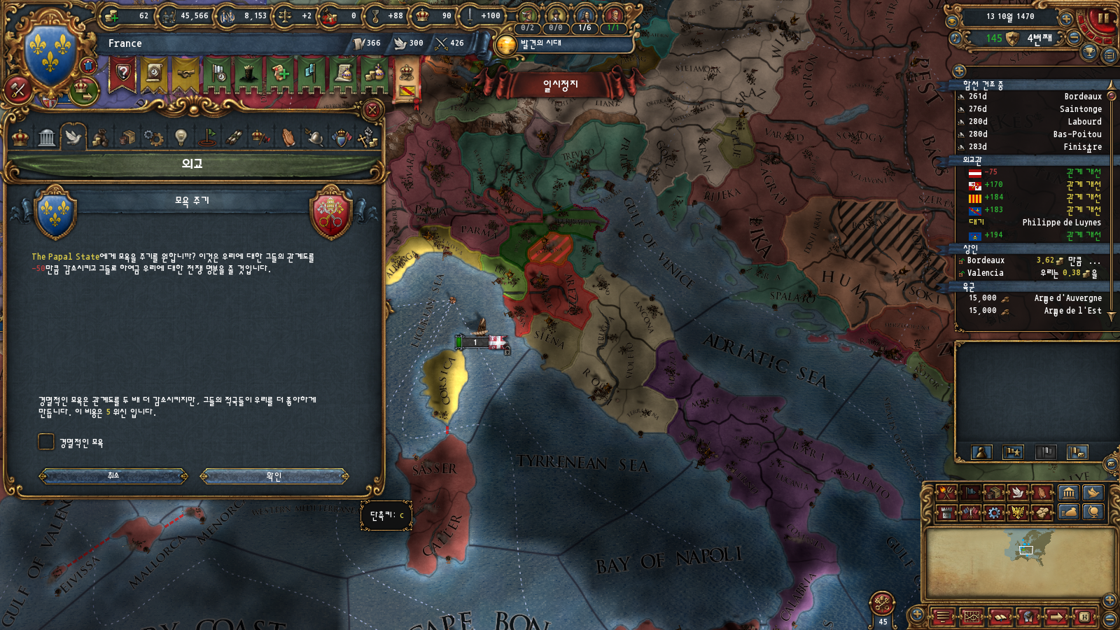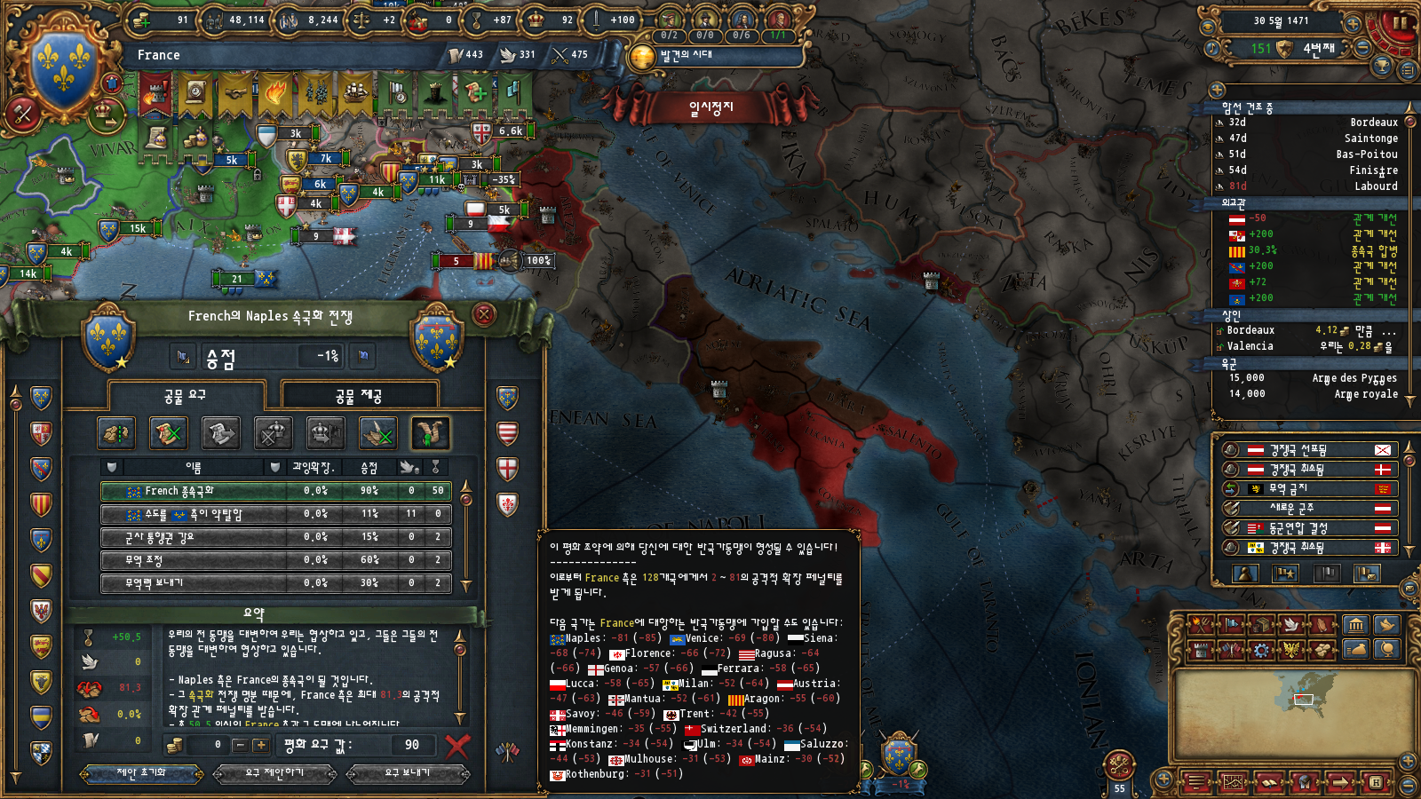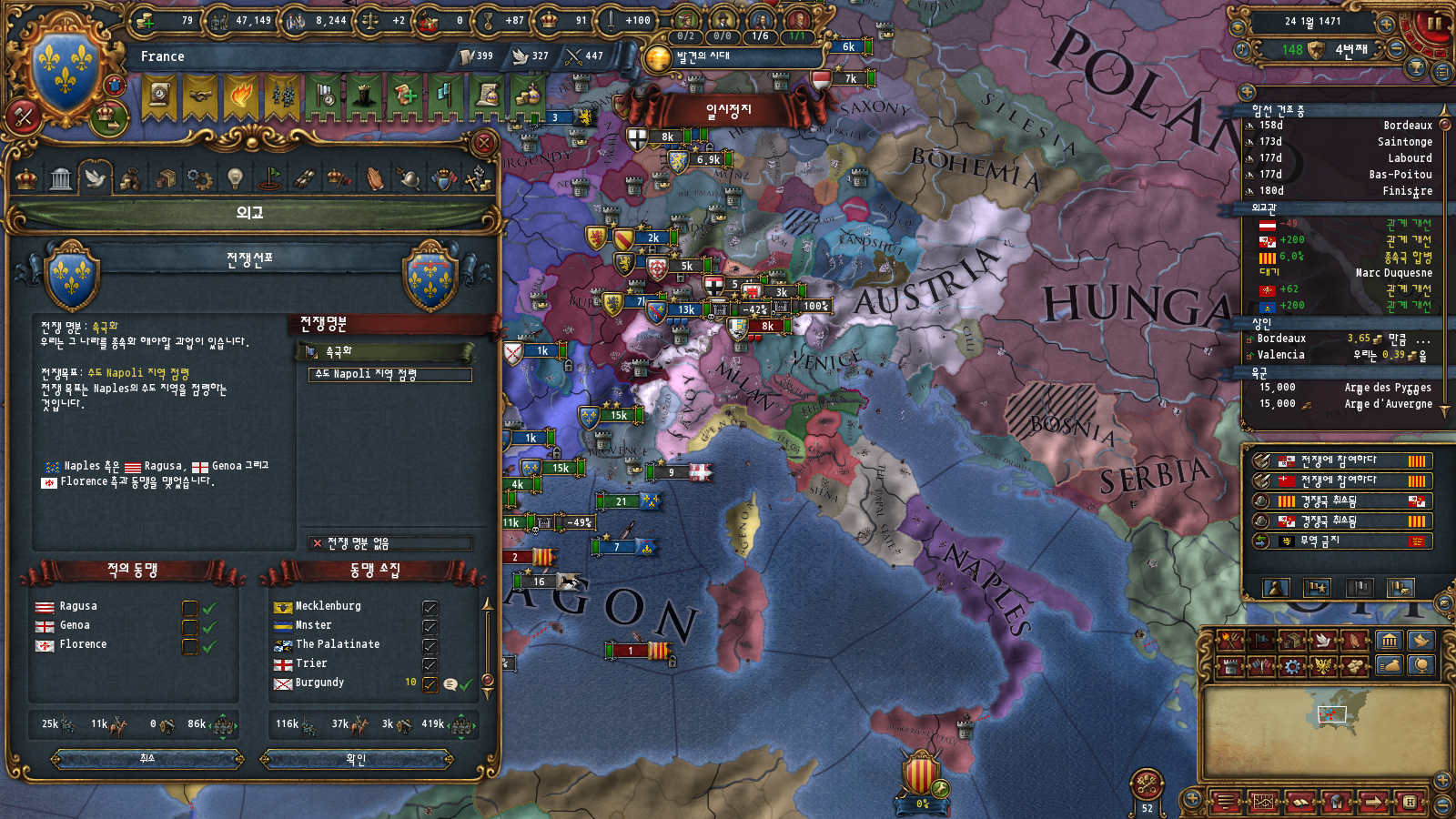 하지만 이전에 말씀드렸듯이 프로방스가 나폴리에 코어를 박는 대신 동군연합 재결성 명분을 받아 온 탓에 나폴리에 빠르게 접근할 권한이 없습니다