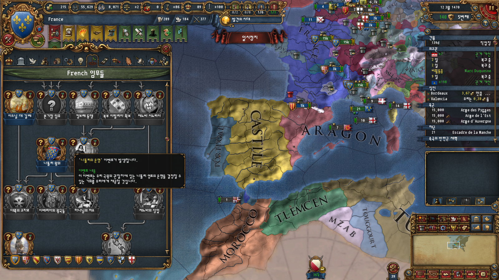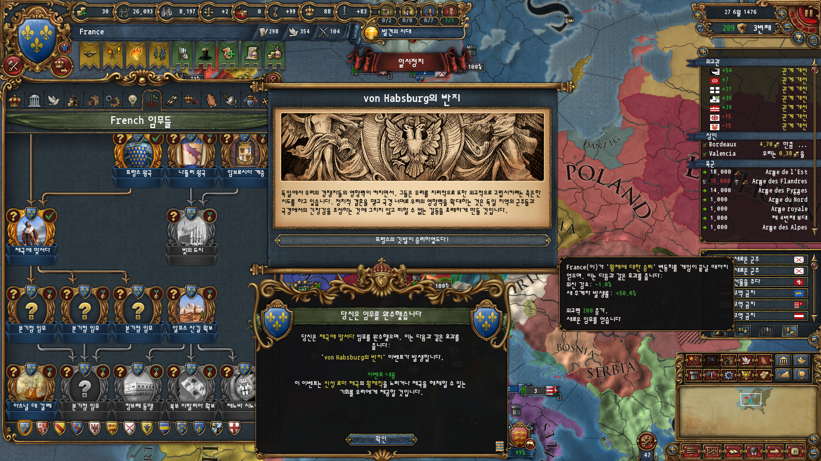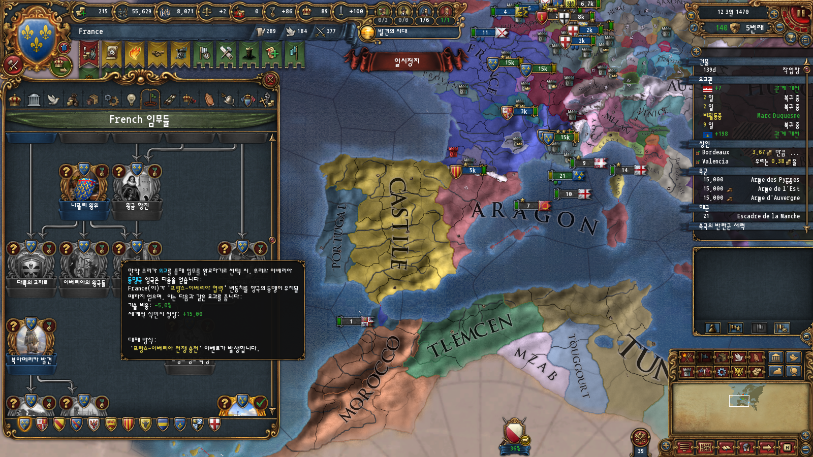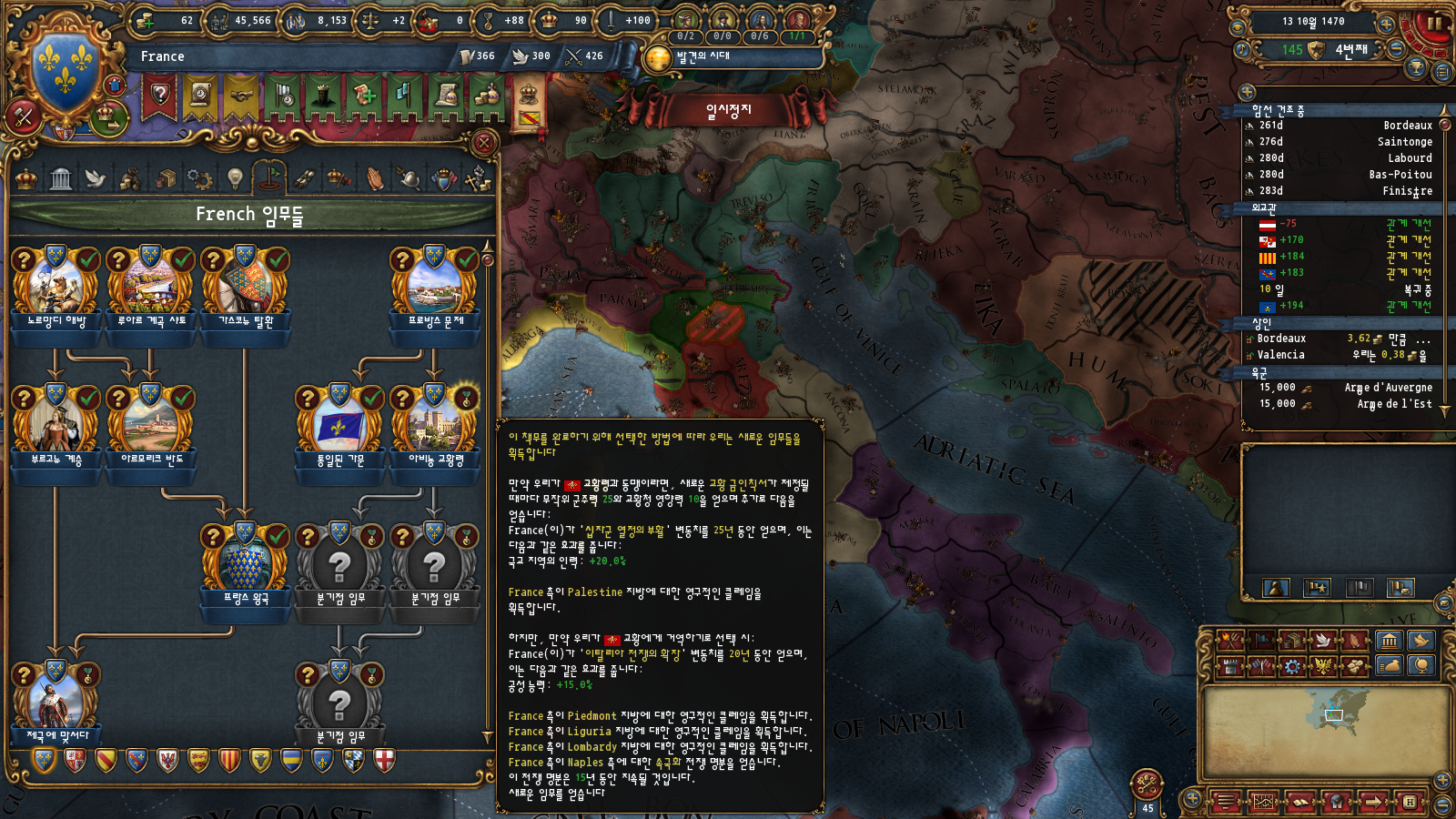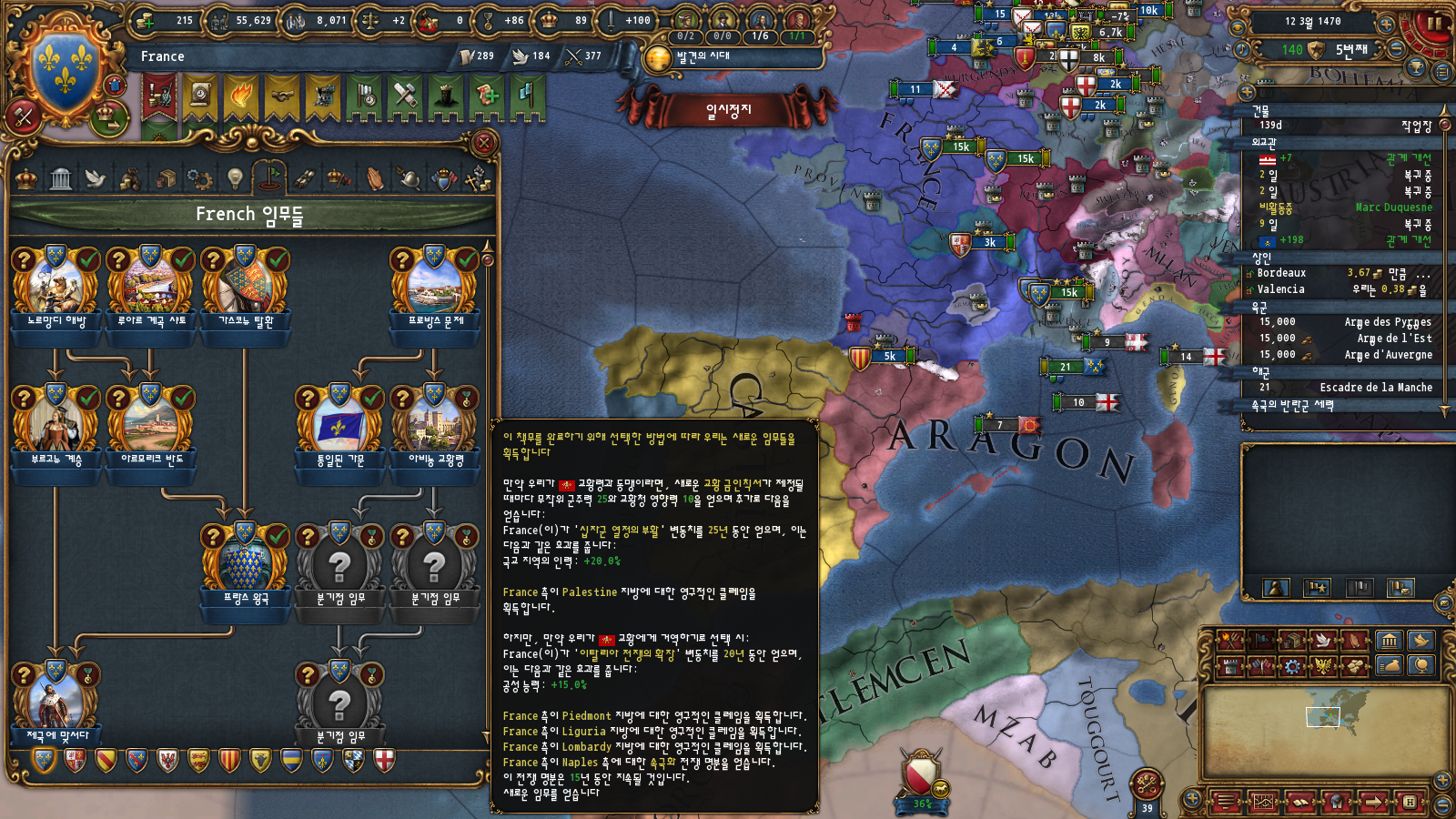초중반에는 미션트리 따라 확장하는 게 편한데, 프랑스는 이탈리아랑 독일 방면 진출을 초반부터 미션트리에서 강하게 지원해주기 때문입니다
