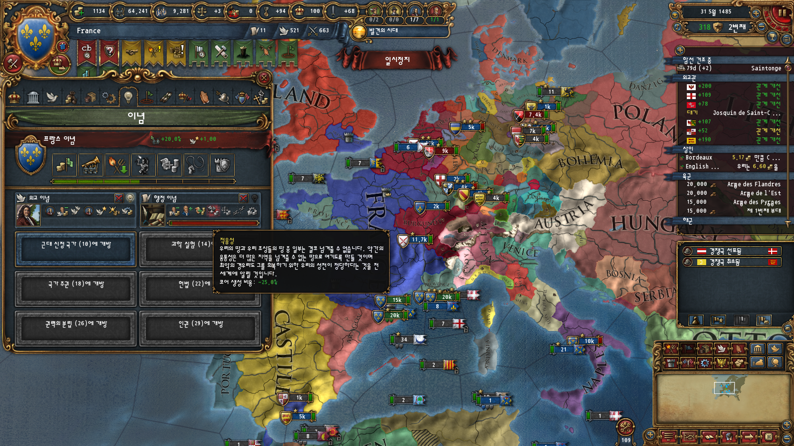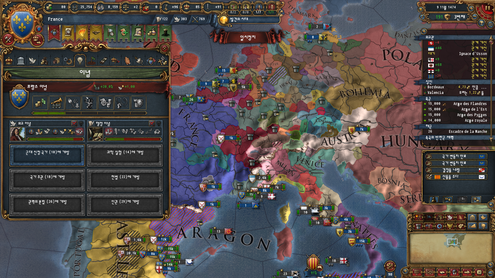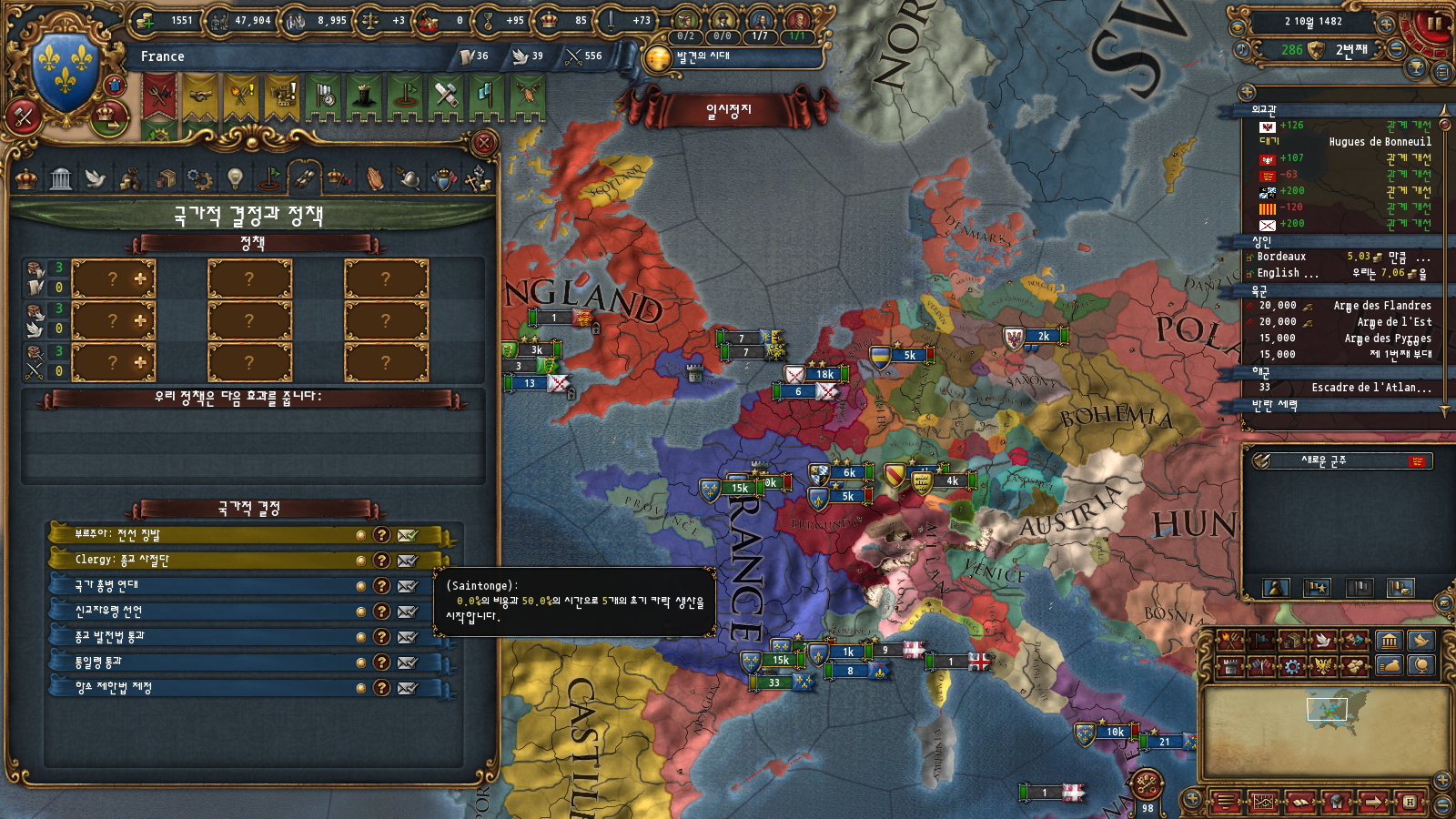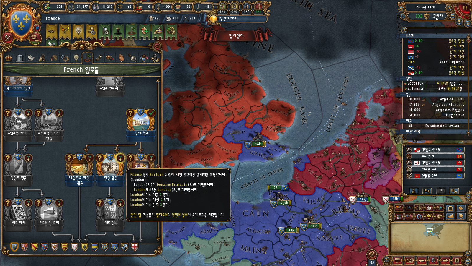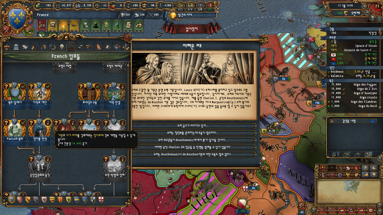 초중반에는 미션트리 따라 확장하는 게 편한데, 프랑스는 이탈리아랑 독일 방면 진출을 초반부터 미션트리에서 강하게 지원해주기 때문입니다