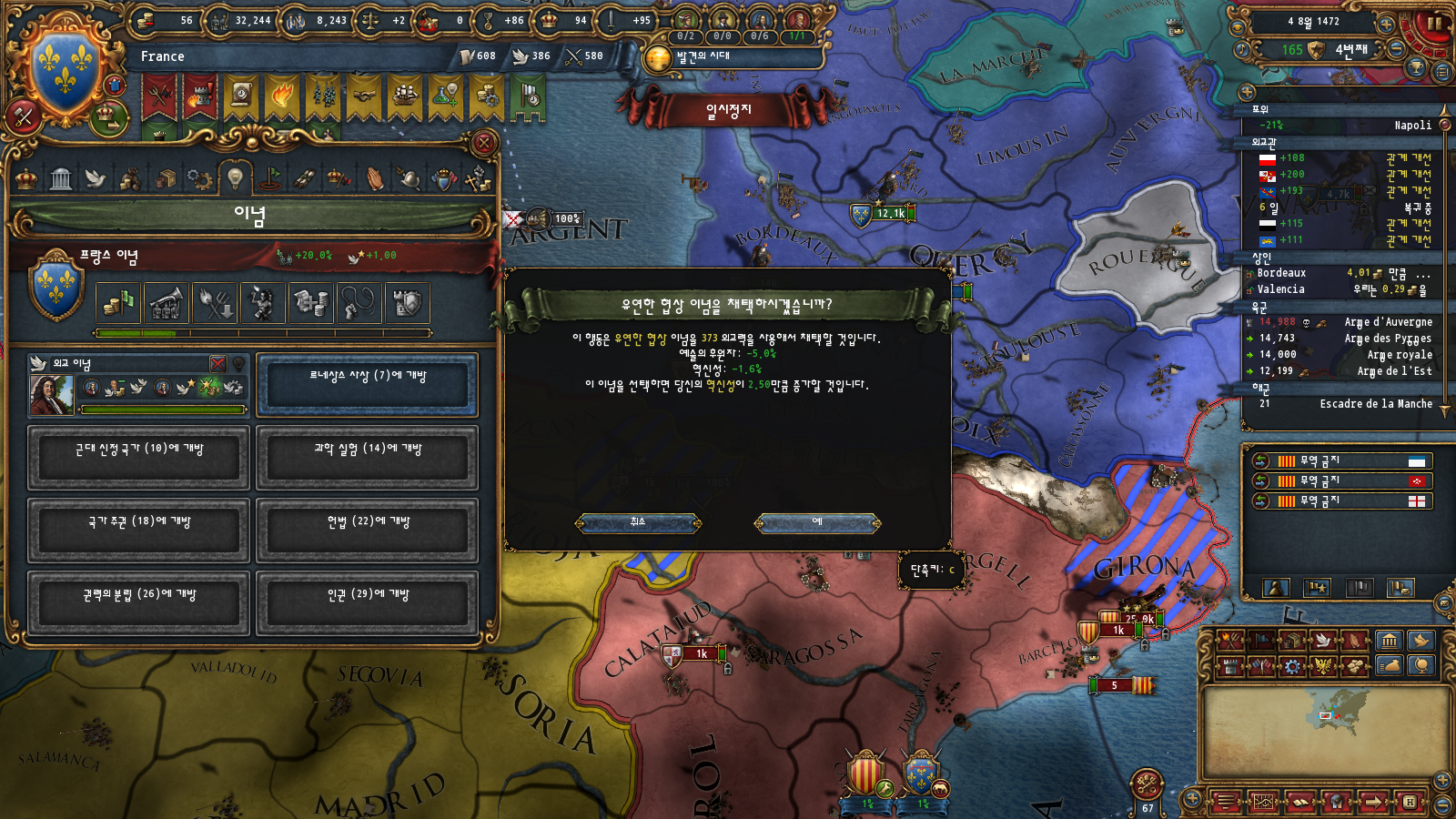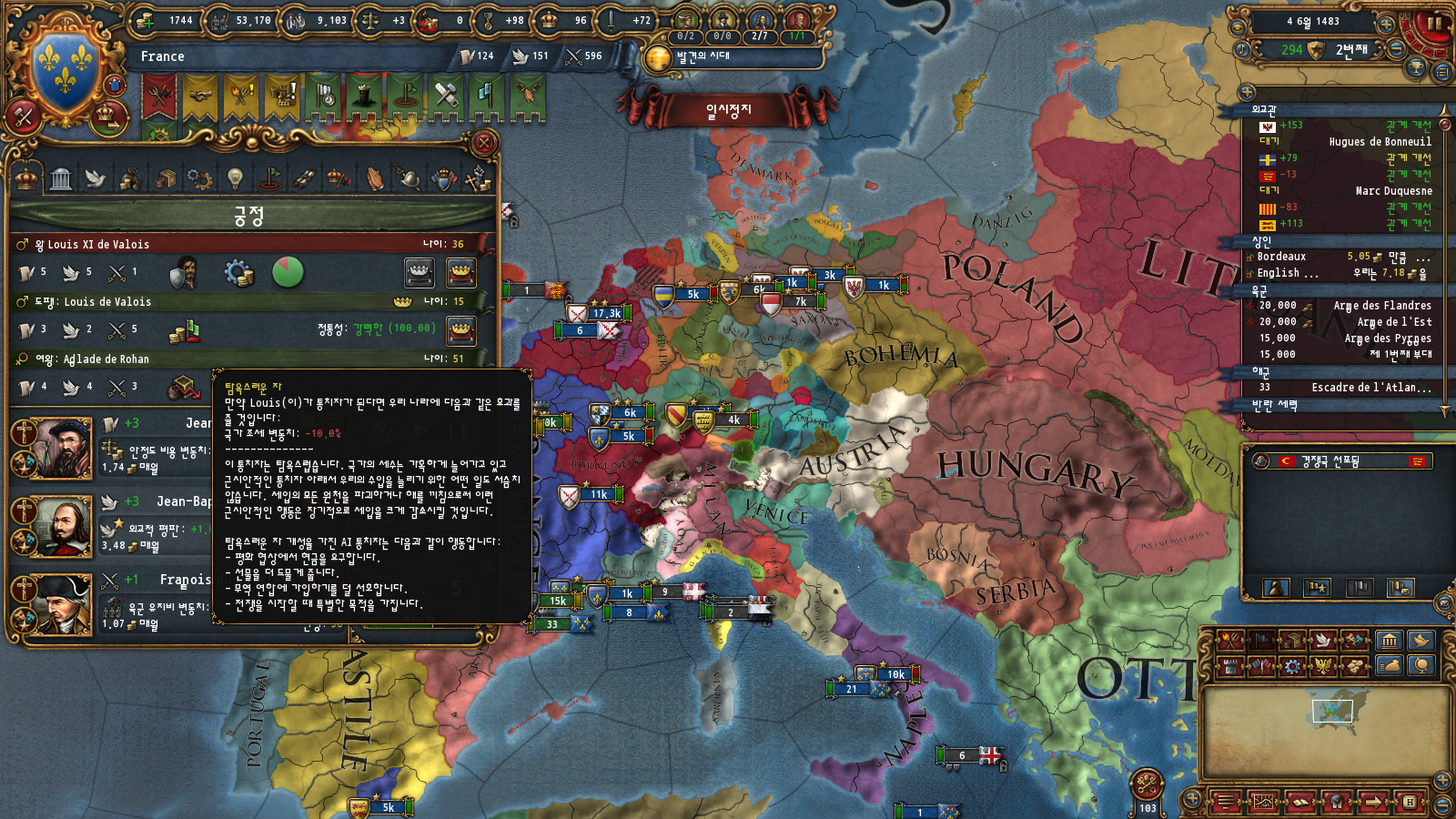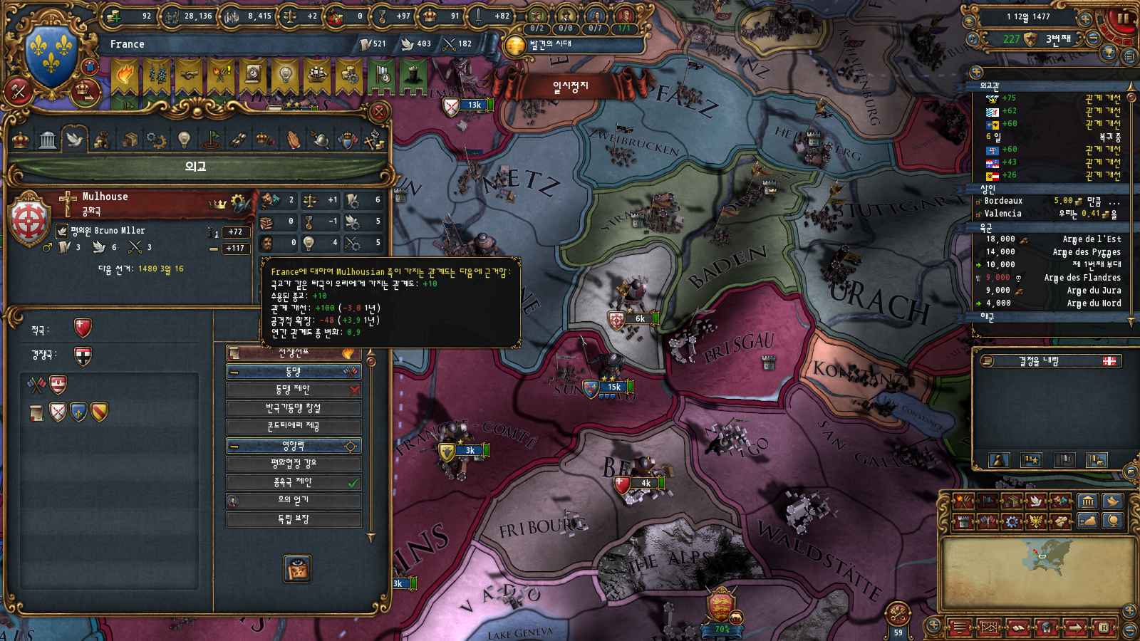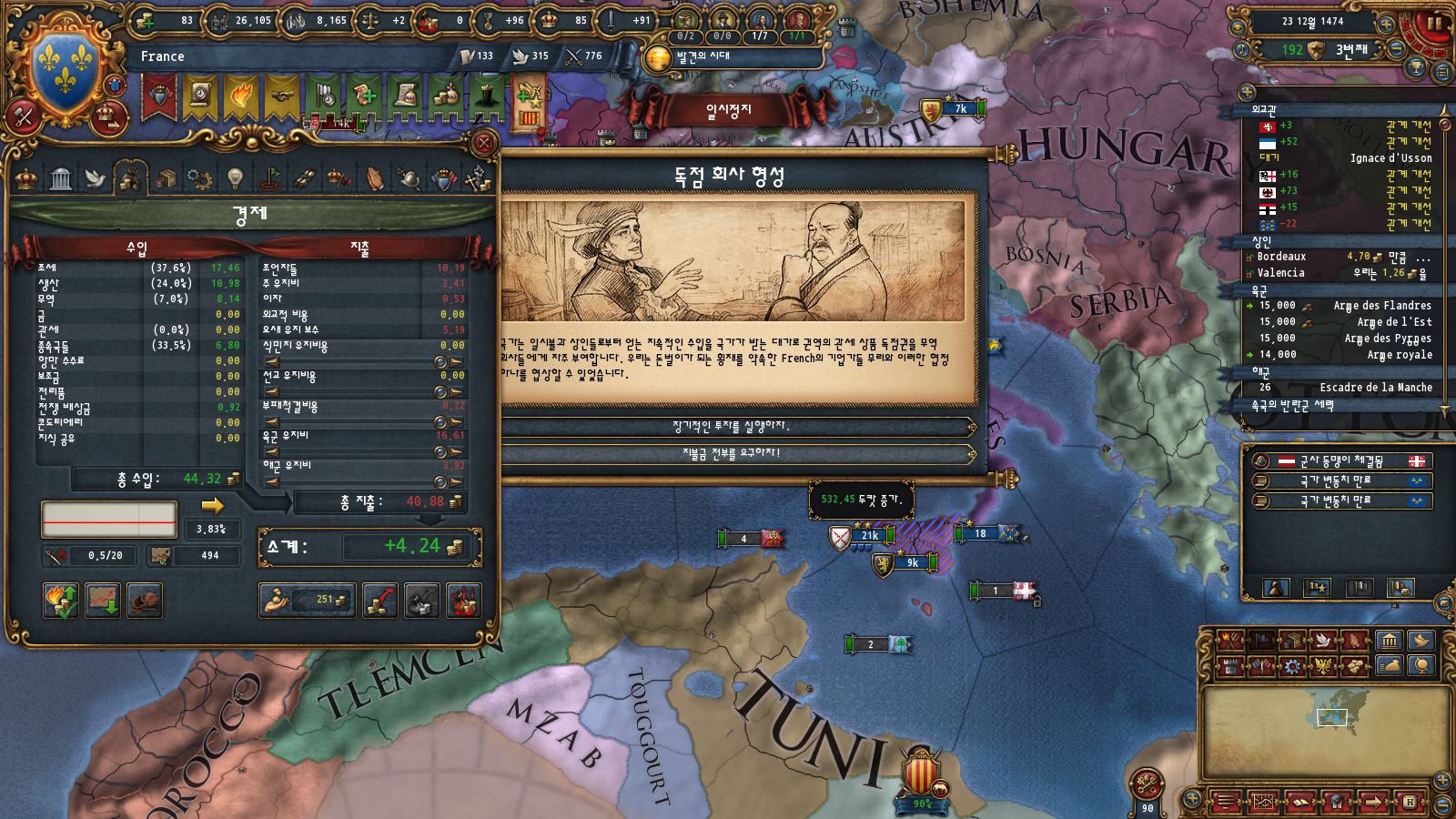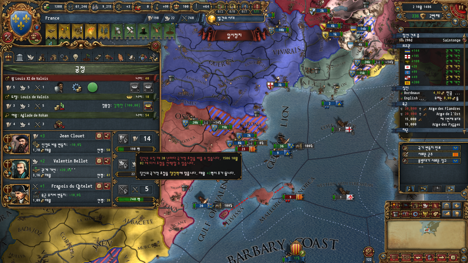 초중반에는 미션트리 따라 확장하는 게 편한데, 프랑스는 이탈리아랑 독일 방면 진출을 초반부터 미션트리에서 강하게 지원해주기 때문입니다