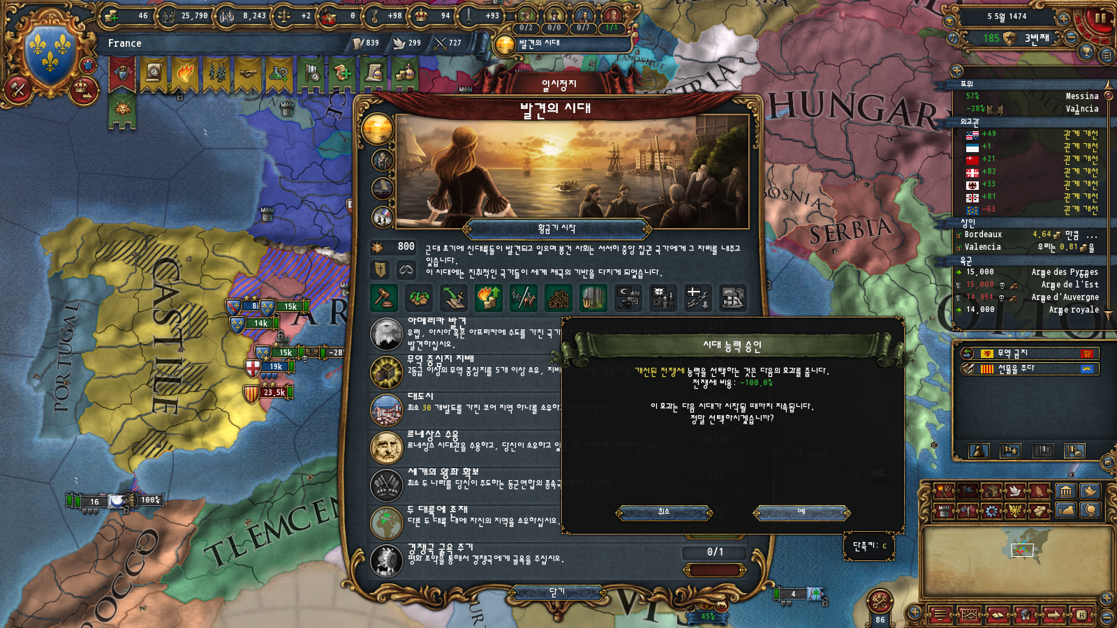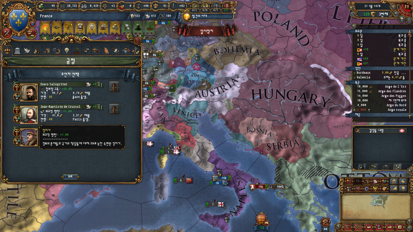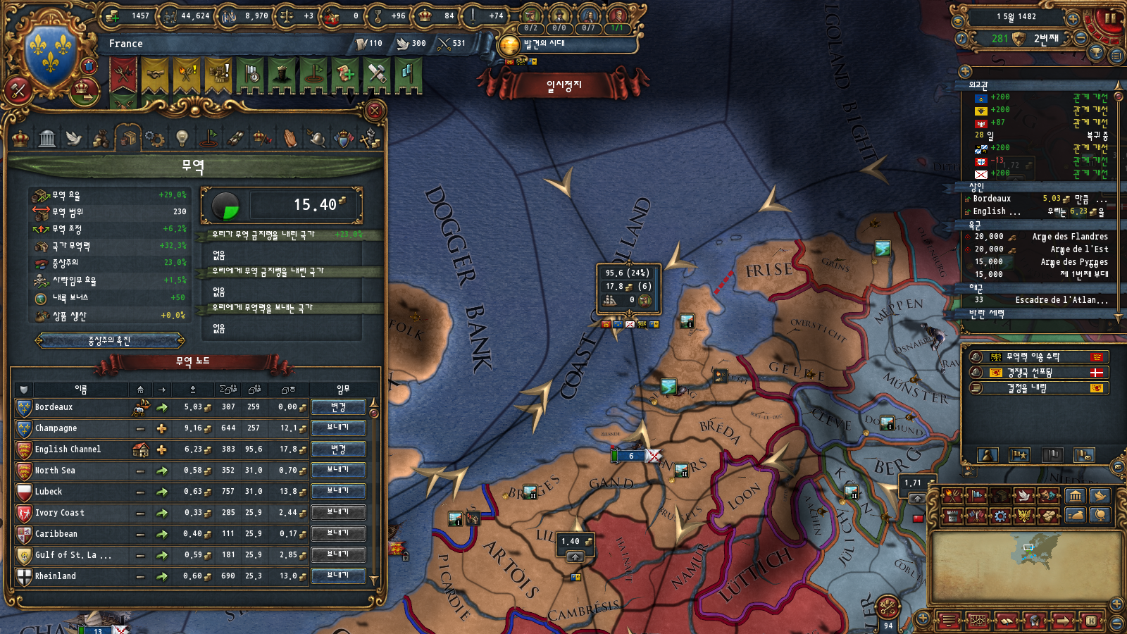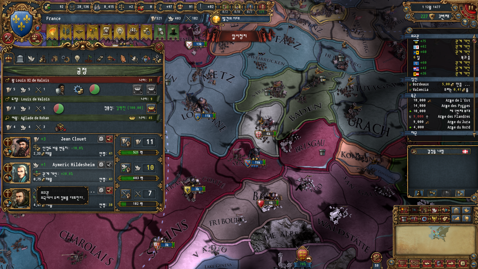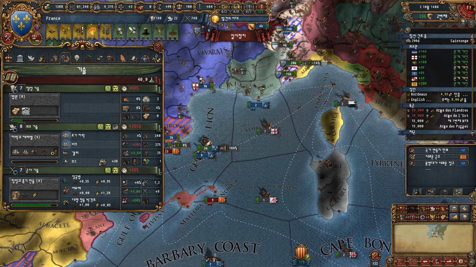 초중반에는 미션트리 따라 확장하는 게 편한데, 프랑스는 이탈리아랑 독일 방면 진출을 초반부터 미션트리에서 강하게 지원해주기 때문입니다