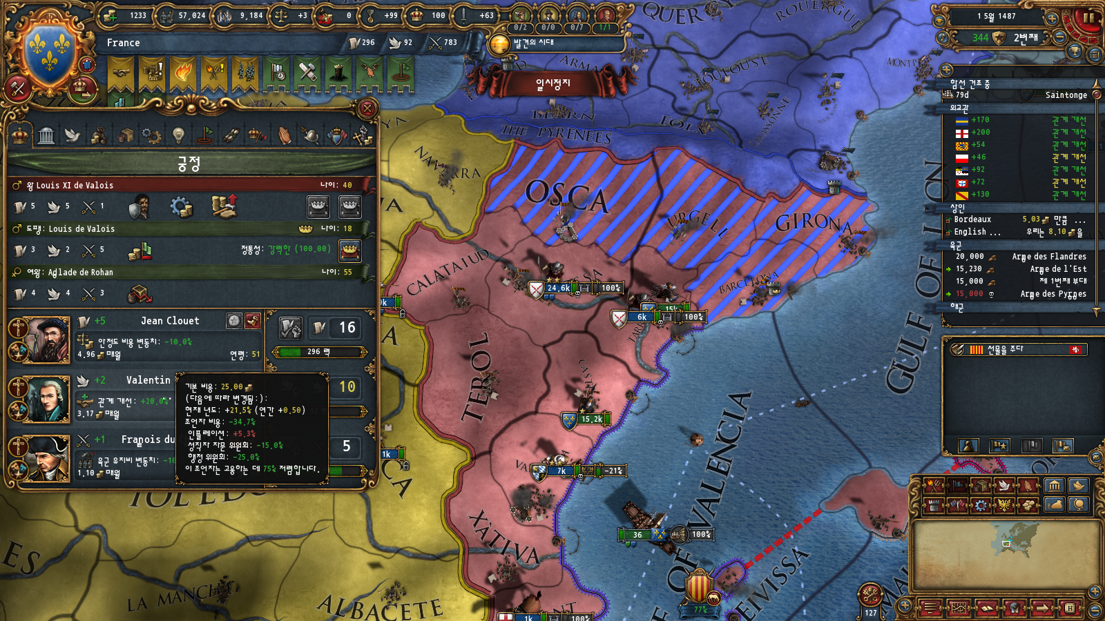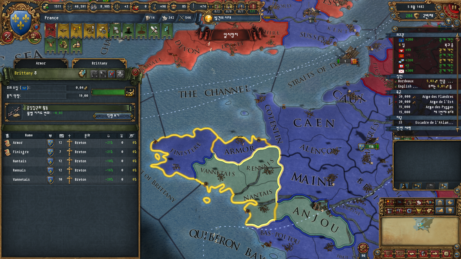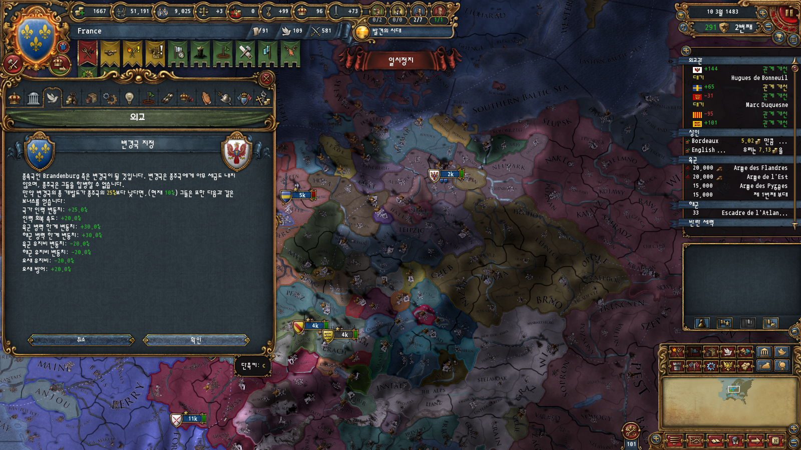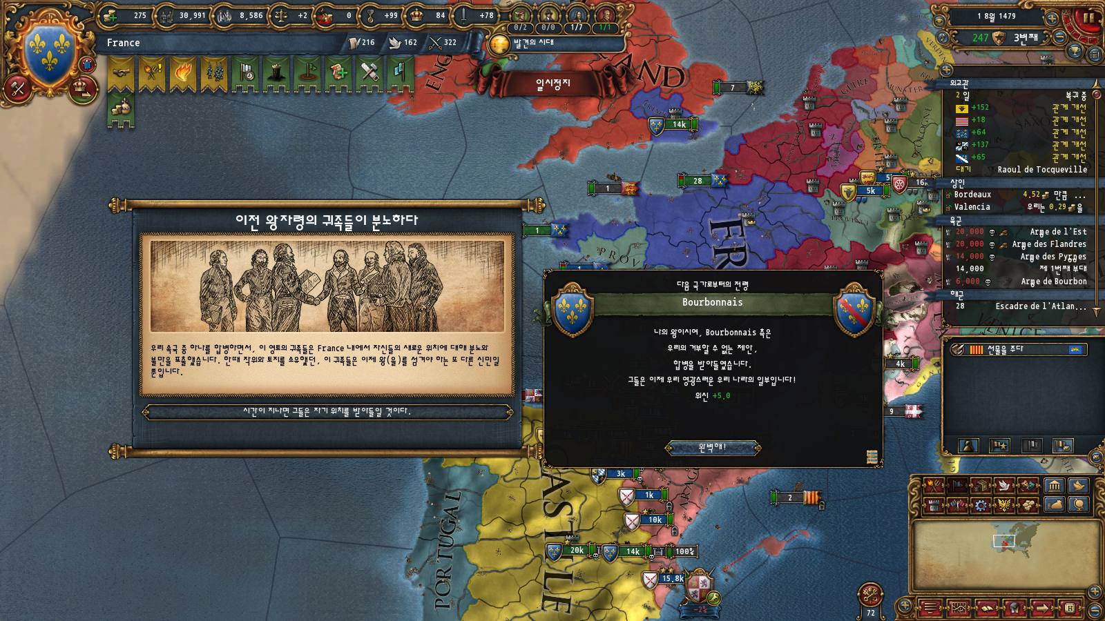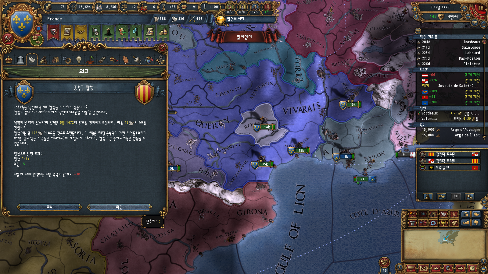 프랑스 권역에 코어가 박혀 있어 합병비용이 조금 덜하긴 합니다만 수동합병까지 가면 결국에 제국 등급 올리는 데 너무 오래 걸리기 때문에 귀찮아요