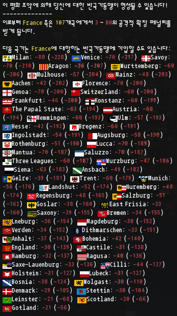 다만, 전쟁 기간이 짧을 것이라 예상될 경우 AE 수치가 낮은 국가부터 역순으로 시작하여 당장 코올리션 가입이 가능한 국가 수 자체를 줄이는 편이 좋습니다