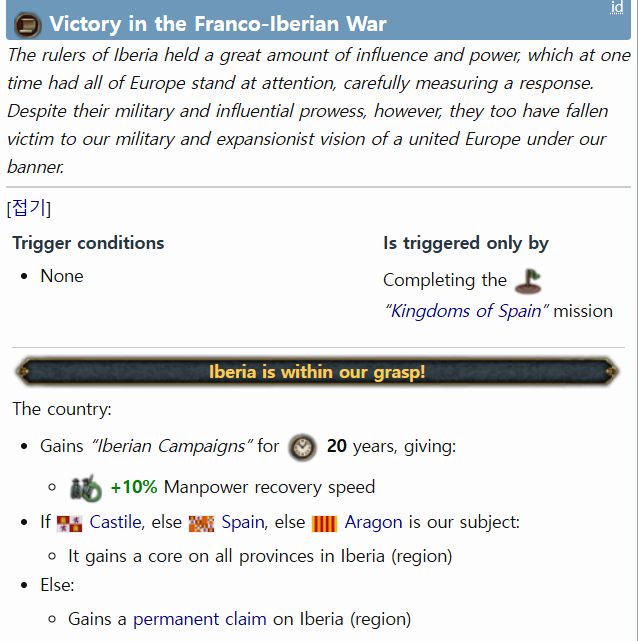 보시면 카스티야, 스페인, 또는 아라곤이 속국일 경우 프랑스가 이베리아 권역 영구 클레임을 받는 게 아니라 해당 속국이 이베리아 권역에 무려 "코어"를 가지게 됩니다