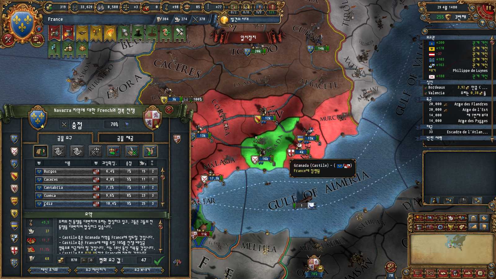 카스티야로부터는 아직 클레임이 없기 때문에 알함브라가 있는 그라나다 지방만 뜯어와줍니다