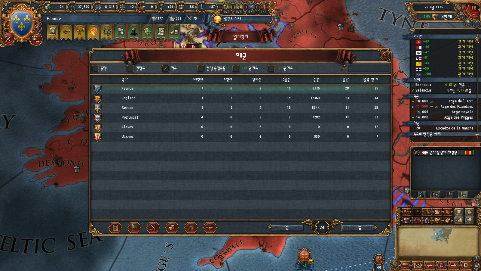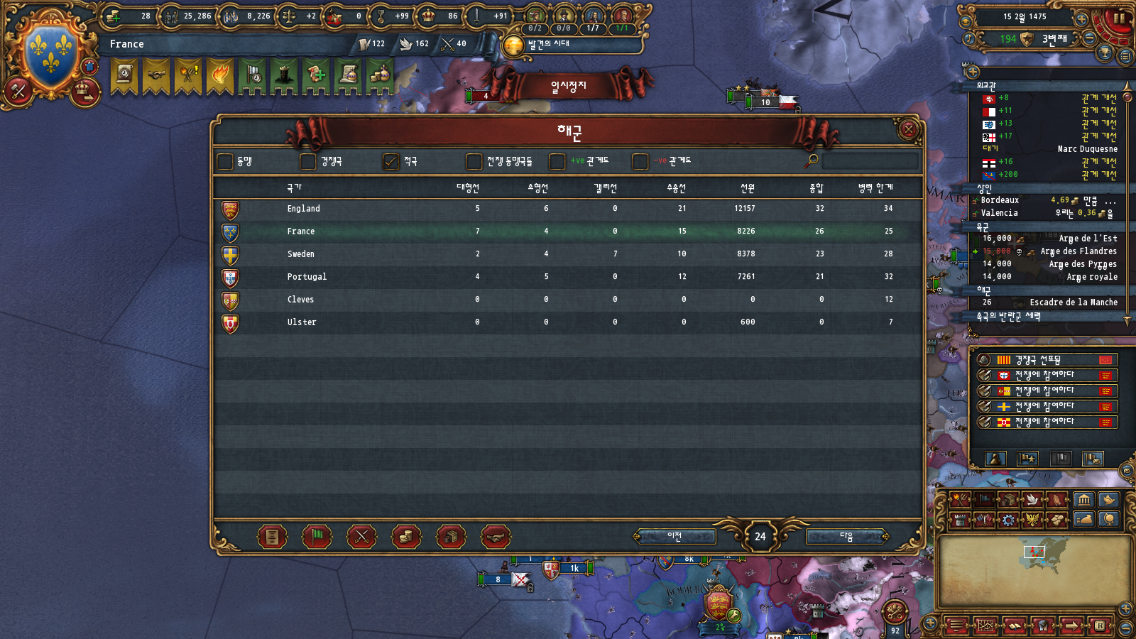 이게 6번 조건을 계산할 때 당장 프랑스가 전쟁 중인 국가의 전력도 합산하기 때문입니다