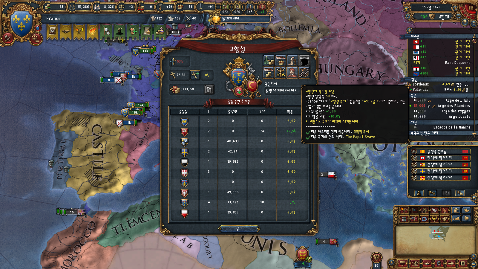 그리고 교황 속국화 루트는 교황을 포함한 다른 속국 독립 열망 관리가 꽤 힘들어진다는 단점이 있는데, 이게 아라곤까지 속국으로 데려갈 경우 더 문제가 될 것 같더라구요 오히려 없는 쪽이 편할 것 같았습니다