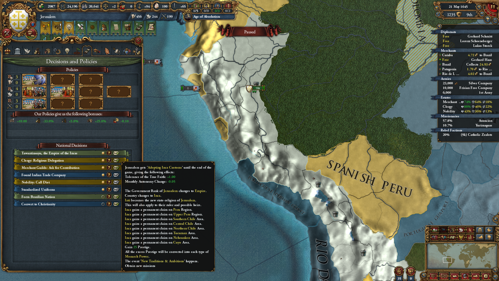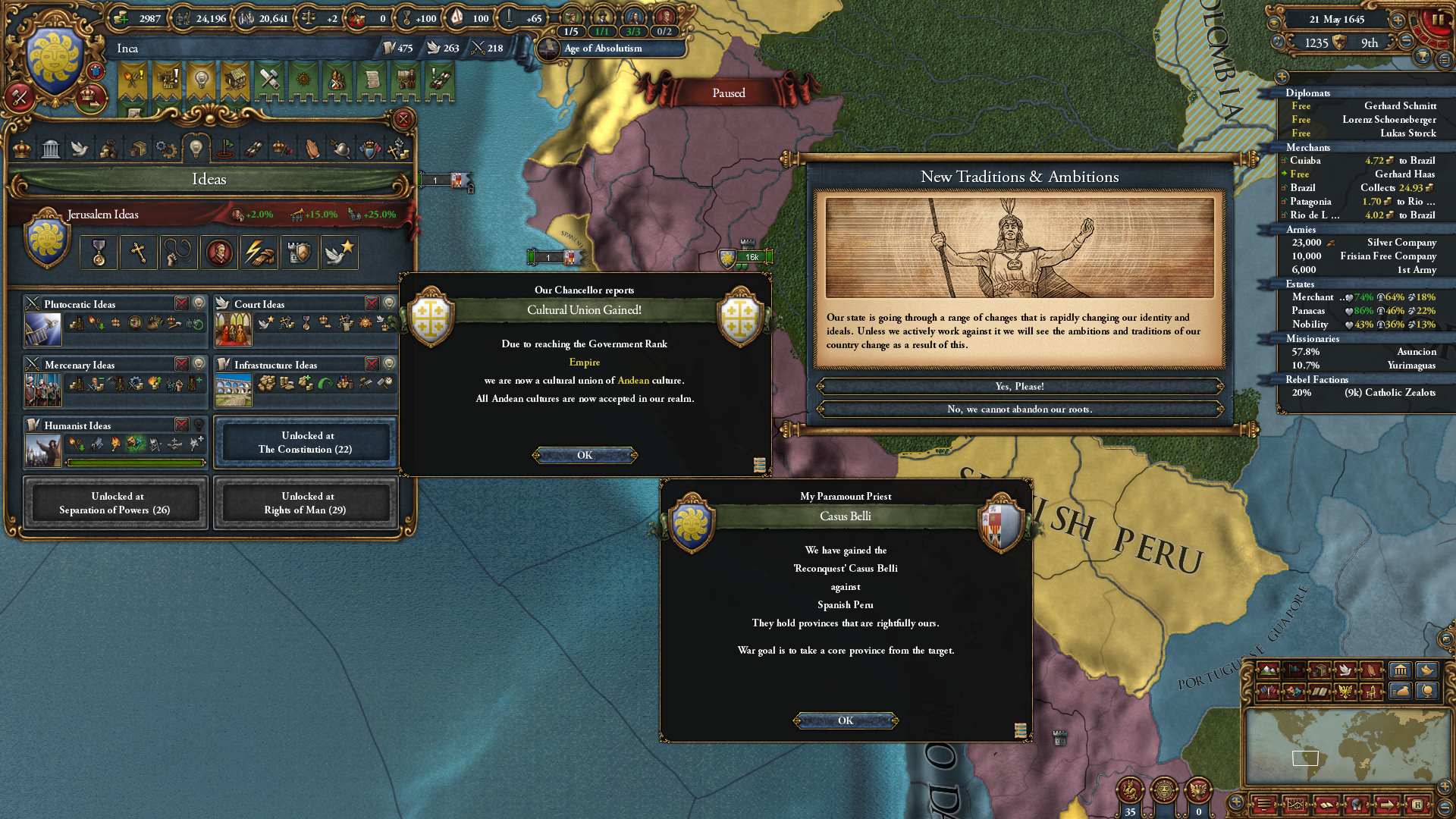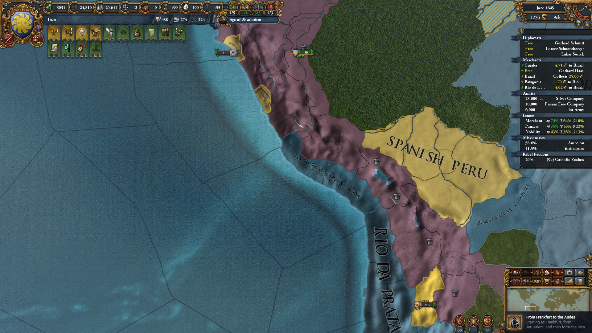 이후 잉카 형성에 필요한 지역을 정복해나가기 시작. 잉카가 먼저 형성되버려서 국가 형성이 안 되면 어떡하나 싶었는데, 다행히 멸망시키면 재형성이 가능하더군요.