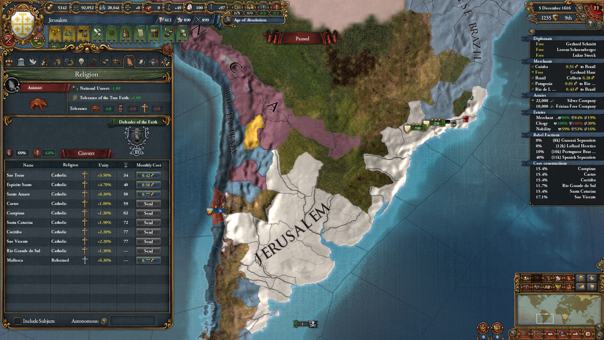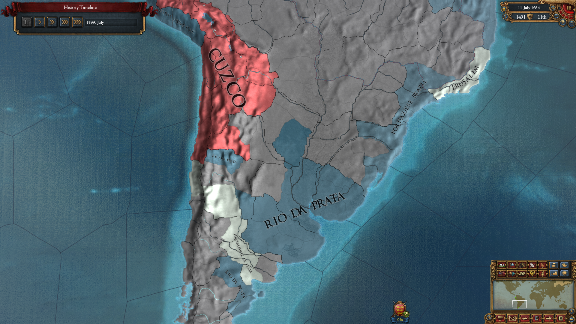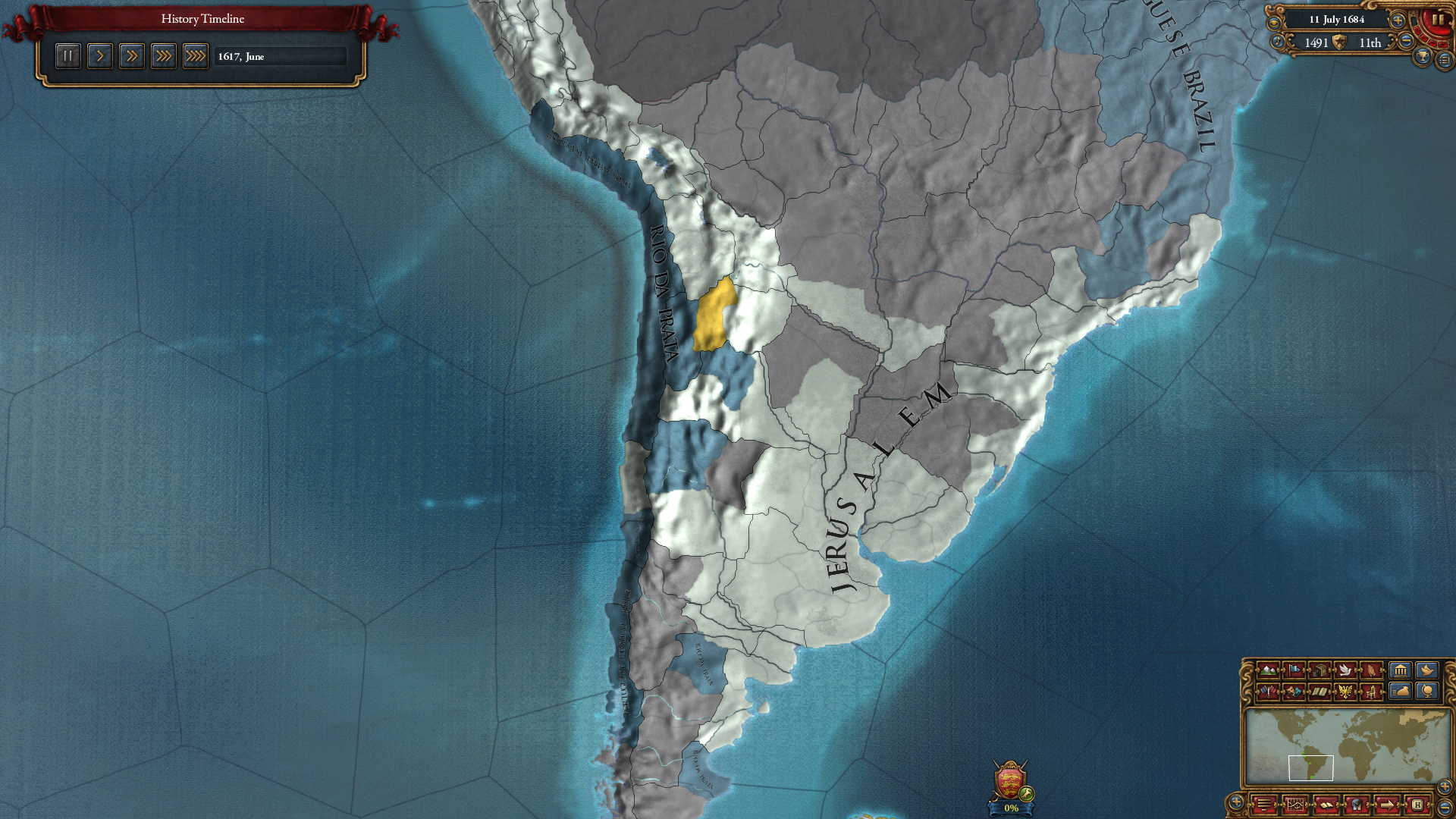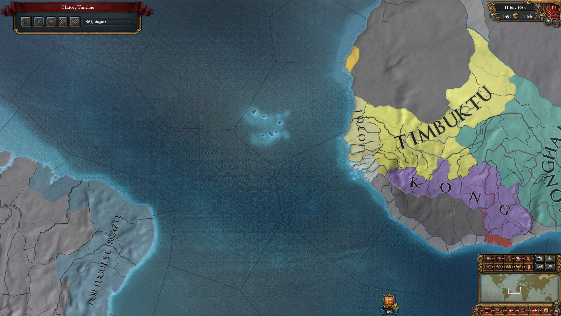 사실 포클랜드 쪽도 먹어뒀으면 수도 이전을 편하게 할 수 있어 좋았는데, 그 생각을 못했습니다. 이거 때문에 구대륙에 있는 땅은 마요르카를 제외하고는 전부 속국에게 넘겨주거나 다른 국가에게 영토 판매하기로 빼야 했고...