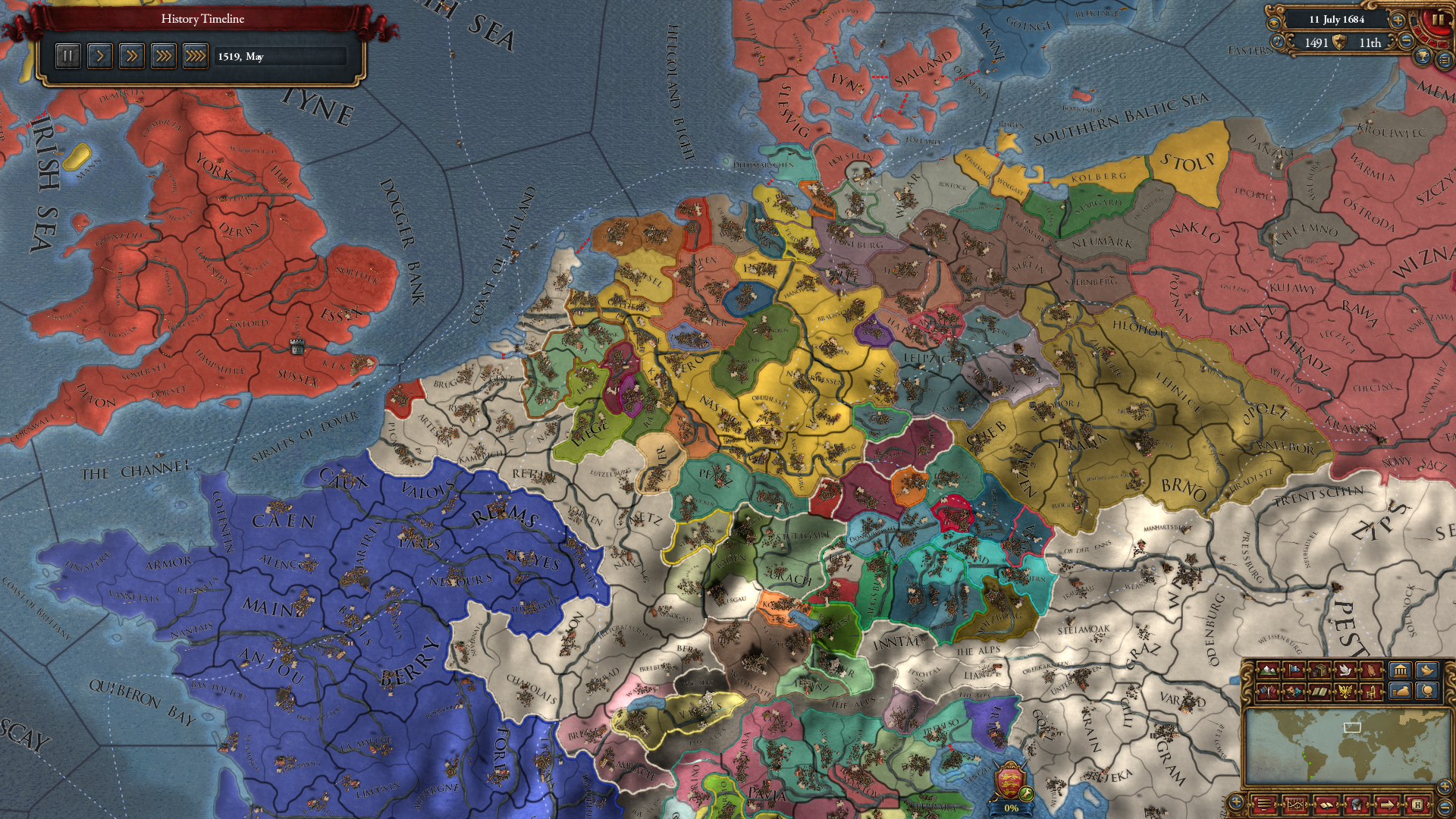 1519년 쯤 독일 중부에서 적당한 세력을 갖추었다고 판단, 탐험의 시대 때 주어지는 클레임 근처 지역에 클레임 날조 가능 기능을 이용해 예루살렘 쪽까지 클레임을 박아줬습니다.