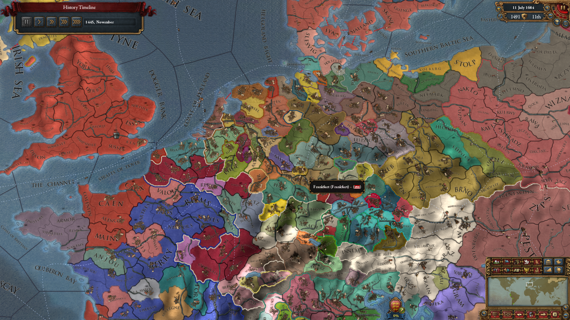 프랑크푸르트로 시작. 자유시기 때문에 초반 침략으로부터 안전하고, 근처 소국들도 많아서 확장하기도 좋습니다. 프랑크푸르트 땅 자체도 농지 + 무역 중심지 + 종이라는 축복받은 곳이지요.