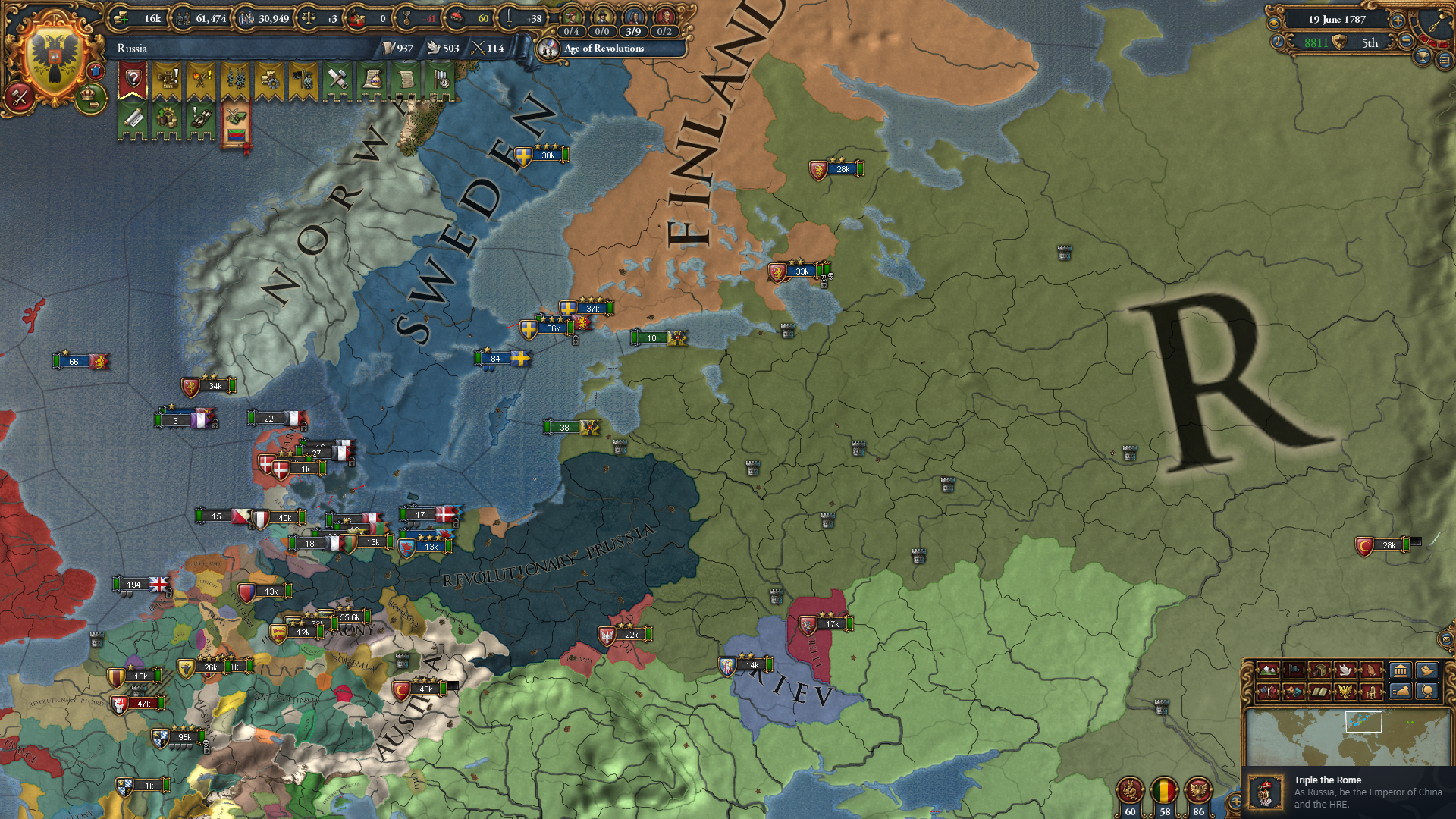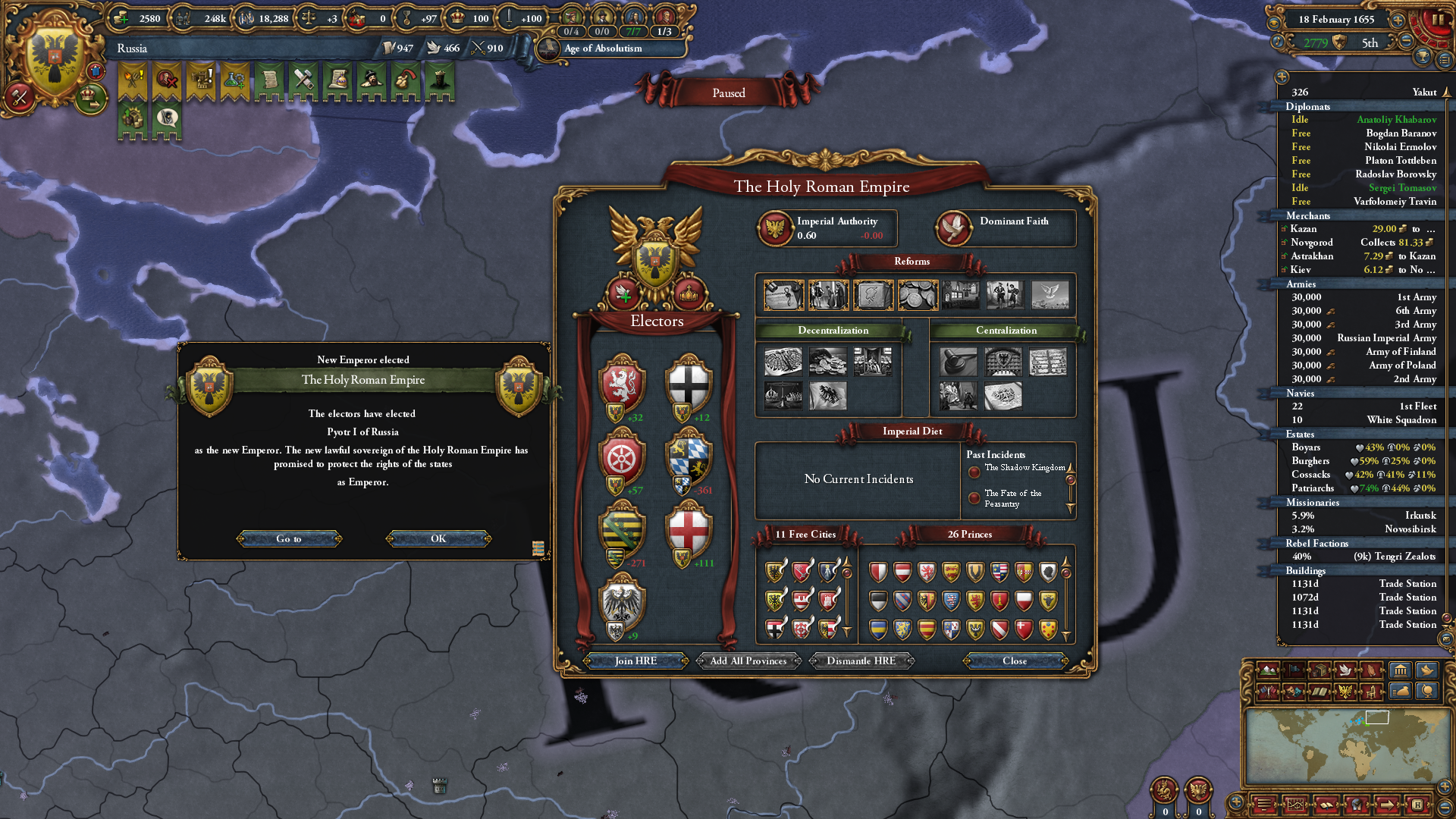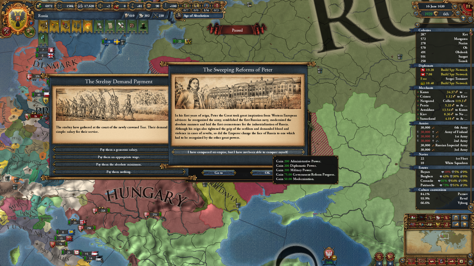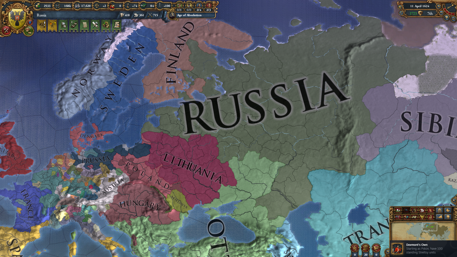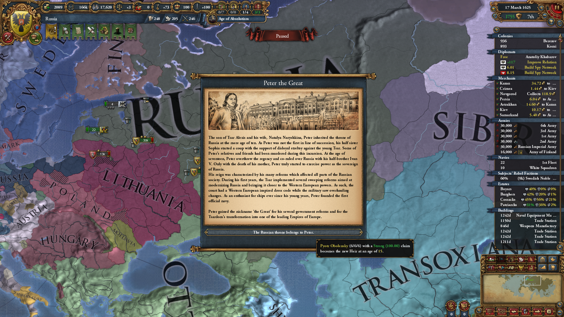 군주정으로 변환하자 발생하는 표토르 대제 이벤트. 후계자로 15살 6/6/6 표토르를 던져줍니다; 왕조는 현재 왕조를 따라가다 보니 로마노프가 아닌 모습.