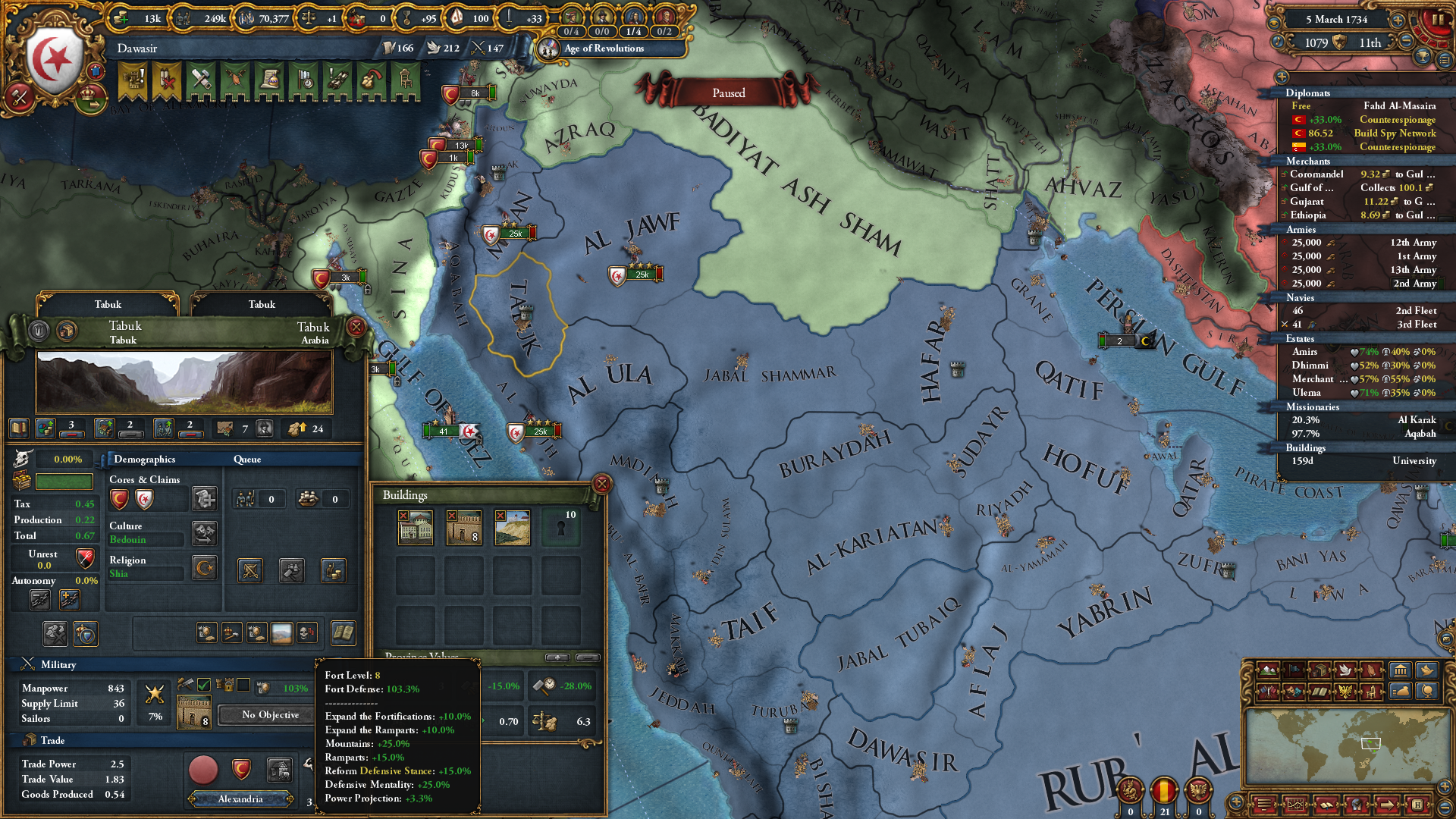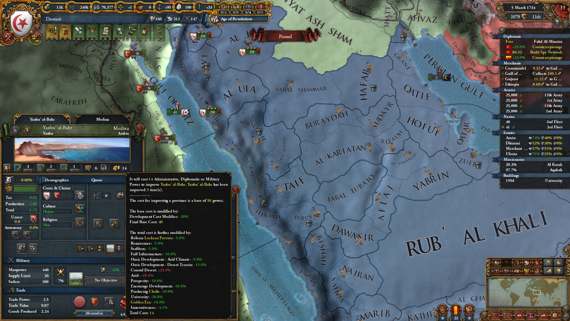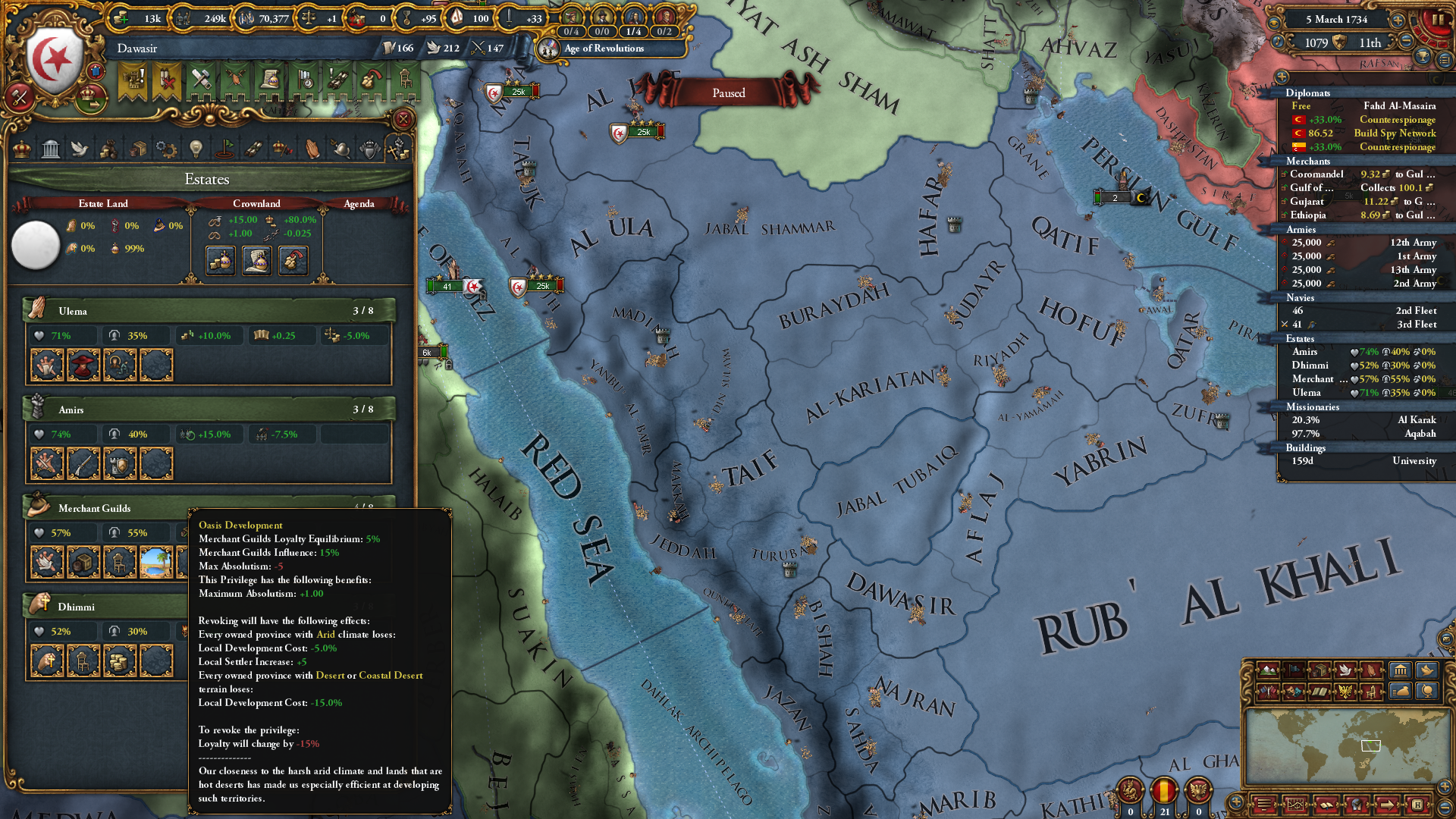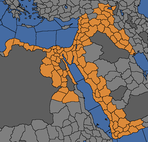 문제가 있다면 아라비아 반도 내 사막과 사막 해안 지형인 지역은 44개밖에 없다는 것이고, 그걸 다 장악하는 건 또 별개 문제라는 거죠. 저는 아무 생각 없이 시아파로 개종했다가(시아파가 수니파보다 전투 성능이 좋다보니;), 맘루크 밀고 난 뒤 오스만하고 관계 유지가 안 돼서 개고생했습니다;; 최신 버전 오스만은 상당히 호전적이라, 휴전 쿨 끝날 때마다 선전포고 하더군요.